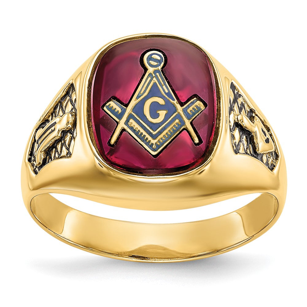 10k Men's Polished and Textured with Black Enamel and Lab Created Ruby Masonic Ring