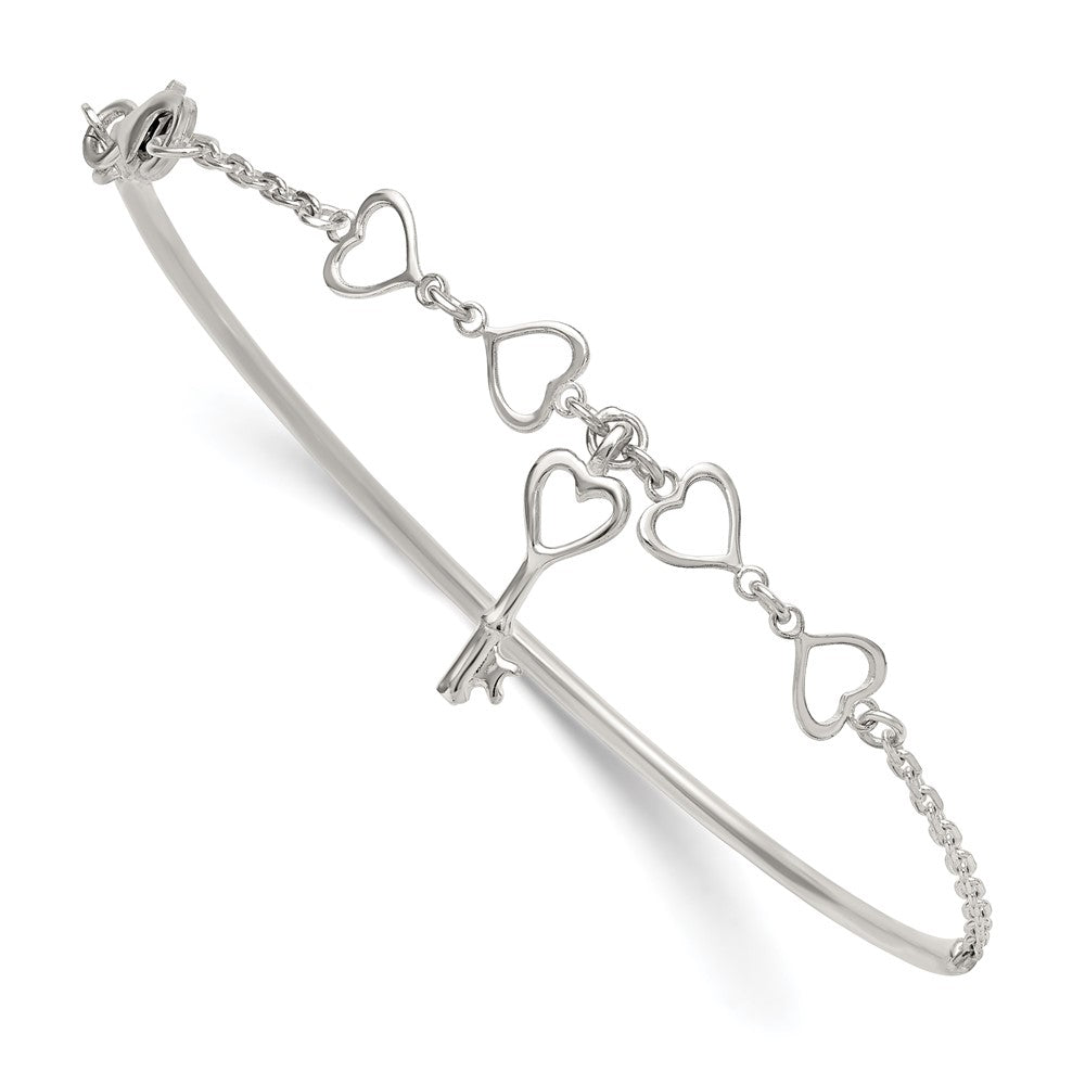 Sterling Silver Polished Open Hearts and Key Charms Half Bangle Bracelet