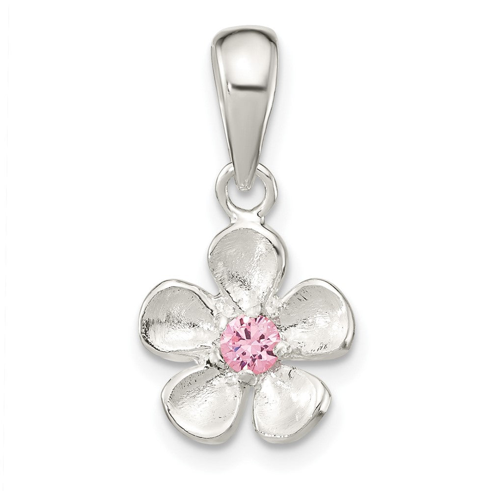 Sterling Silver Brushed & Polished Pink CZ Flower Pendant