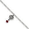 Sterling Silver Dark Pink Crystal Dangling Antiqued Heart 9 inch Anklet