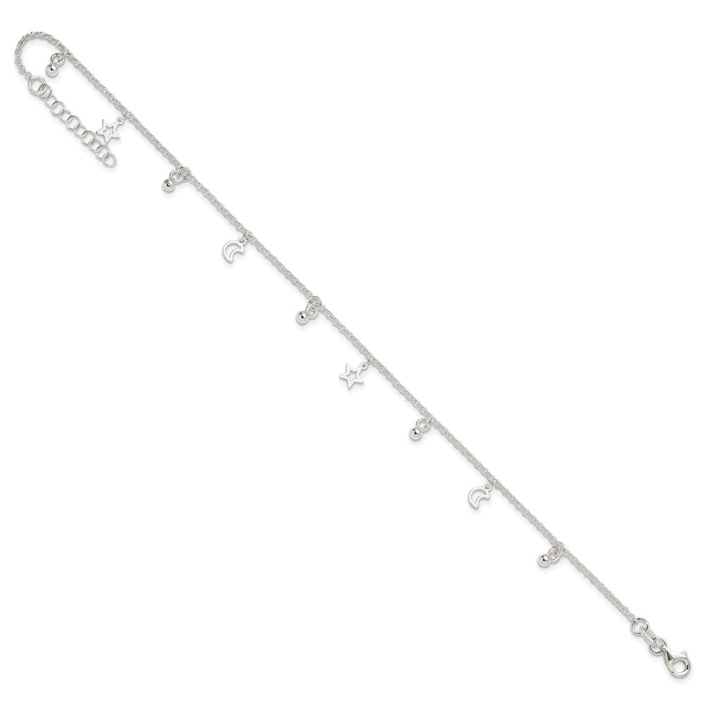 Sterling Silver Star and Moon 9 inch Plus 1 inch Extender - Total 10 inch Anklet