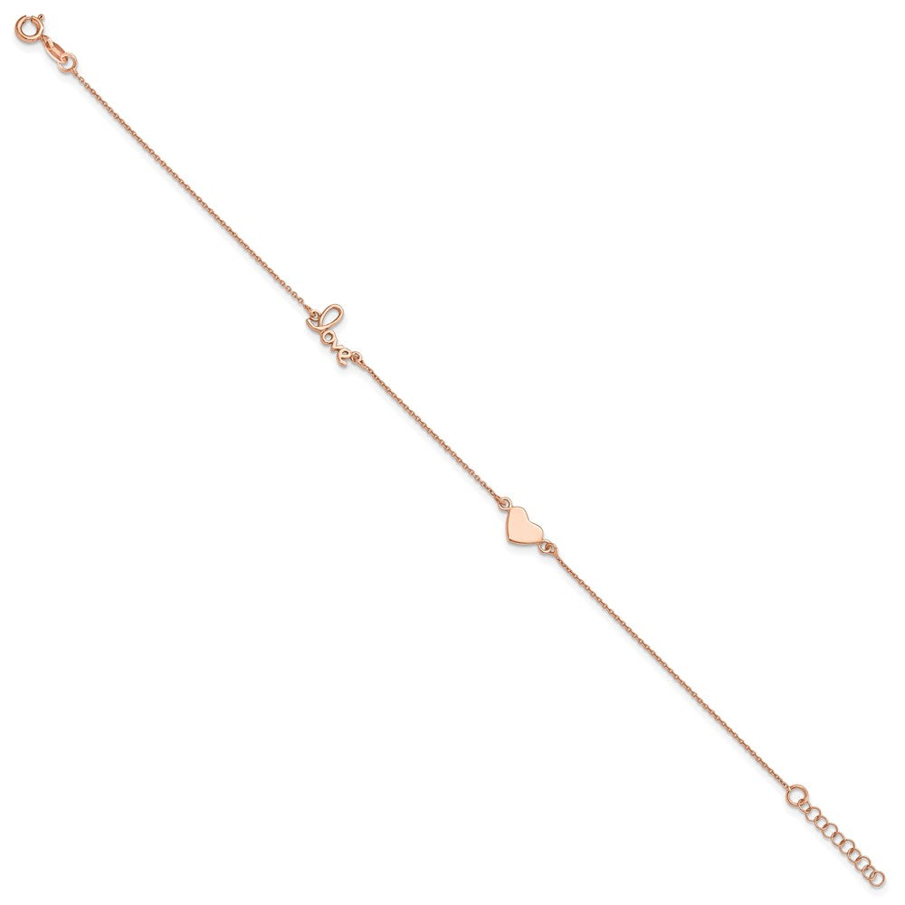 Sterling Silver Rose-tone Heart/LOVE Script 9 inch Plus 1 inch Extender - Total 10 inch Anklet