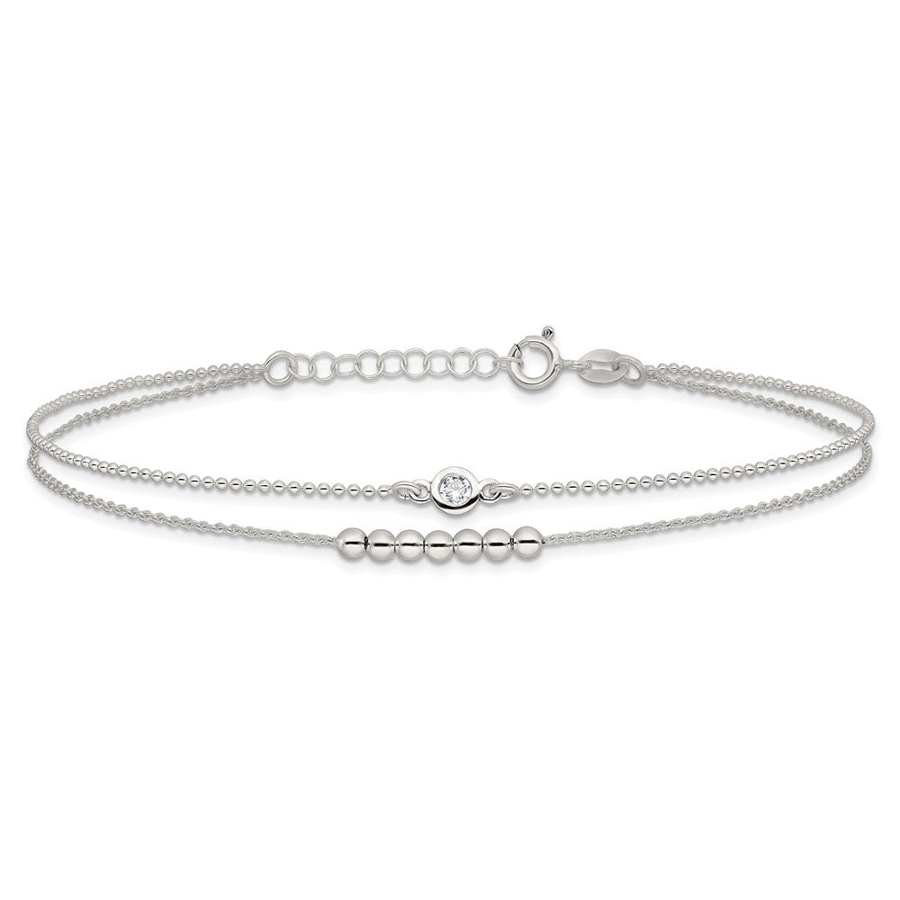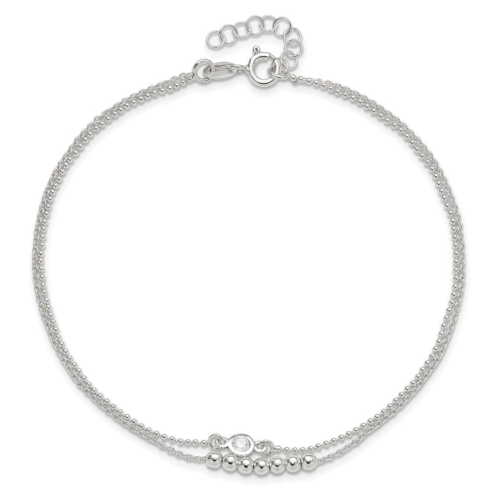 Sterling Silver 2-Strand Beaded CZ 9 inch Plus 1 inch Extender - Total 10 inch Anklet