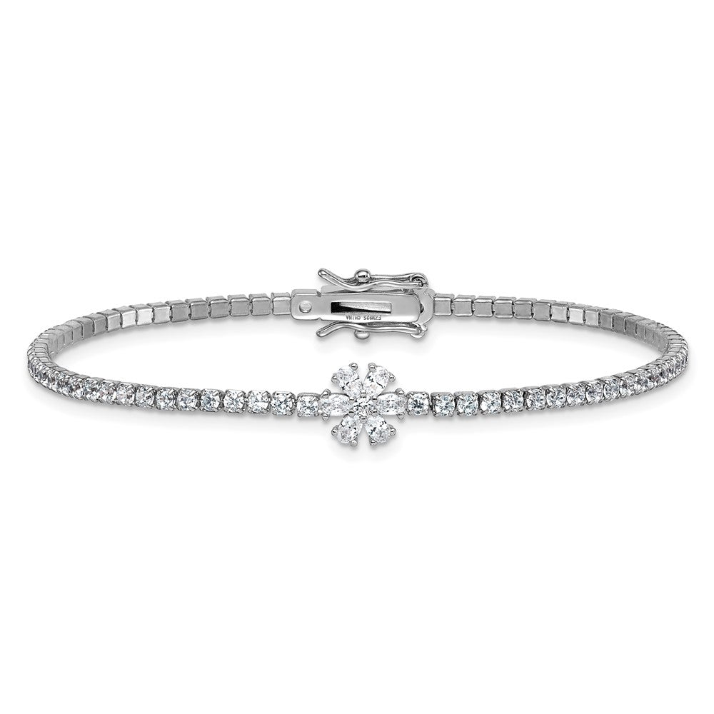 Sterling Silver Rhodium-plated Polished CZ Flower 7.25 inch Tennis Bracelet