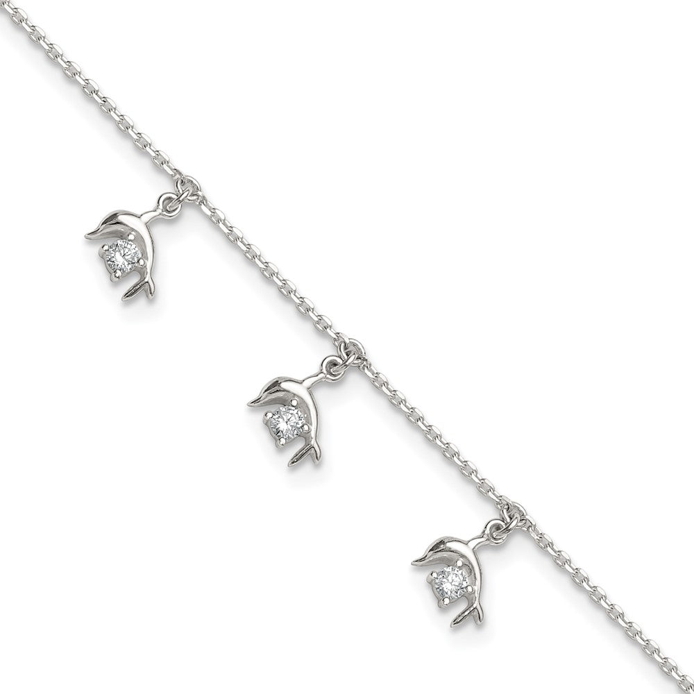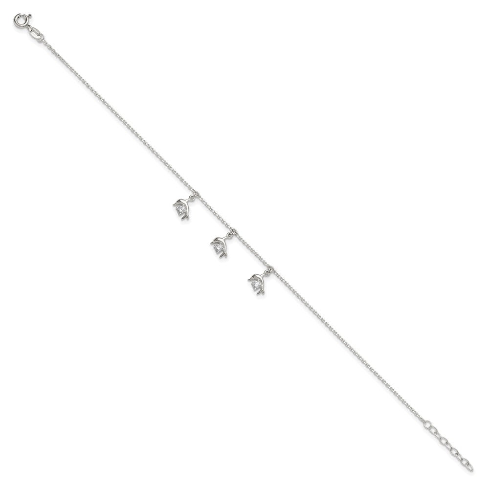 Sterling Silver CZ Dolphin Charms 9 inch Plus 1 inch Extender - Total 10 inch Anklet