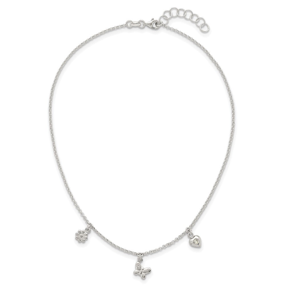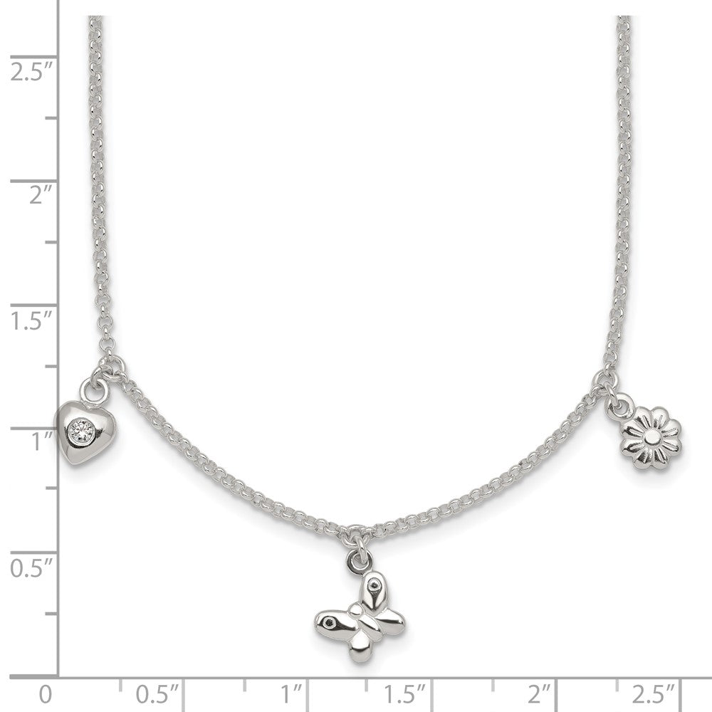 Sterling Silver Polished White CZ Heart/Flower/Butterfly Childrens 14 inch with 1 inch Extension Necklace