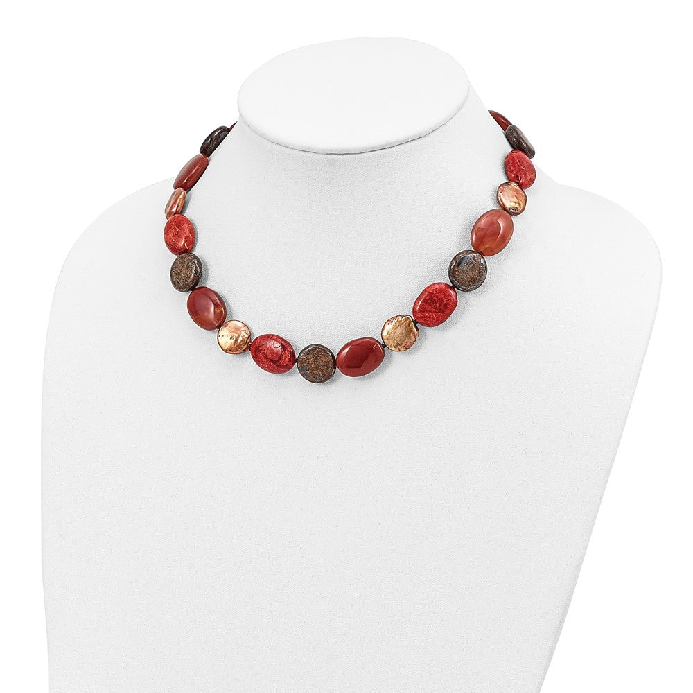 Sterling Silver Tiger Eyes/Carnelian/Reconst. Coral/FW Cult. Pearl Necklace