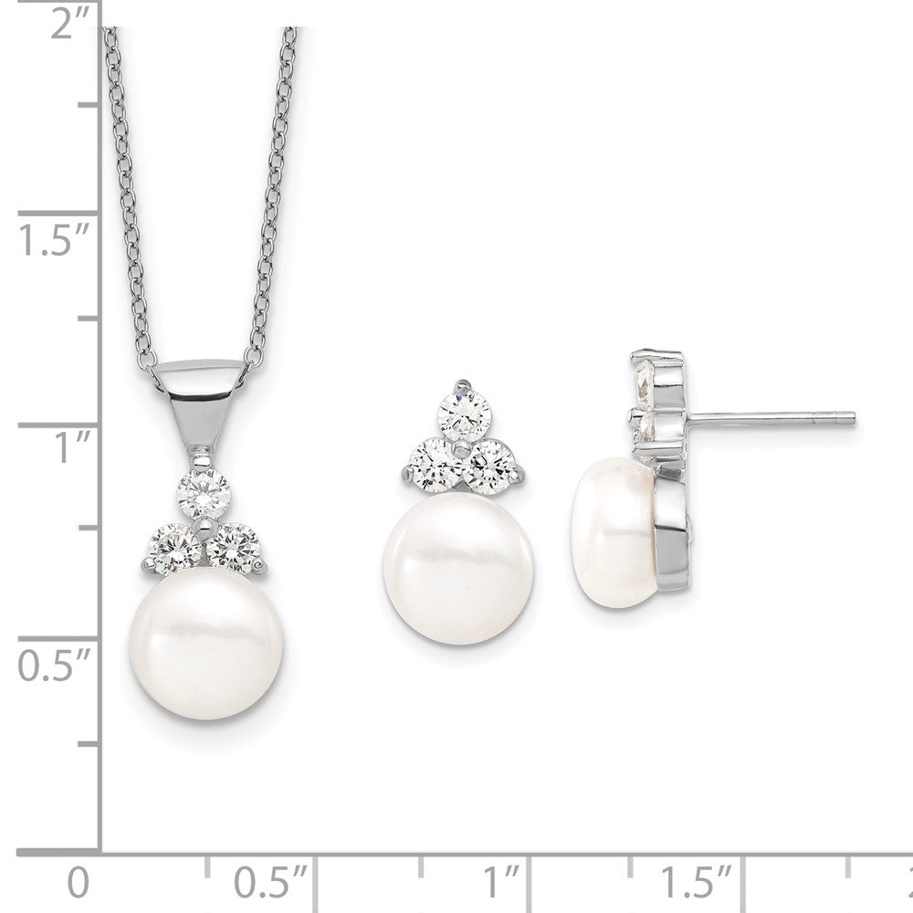 Sterling Silver Rhodium-plated 9-10mm White Button Freshwater Cultured Pearl and CZ 17 inch and Post Earrings Set