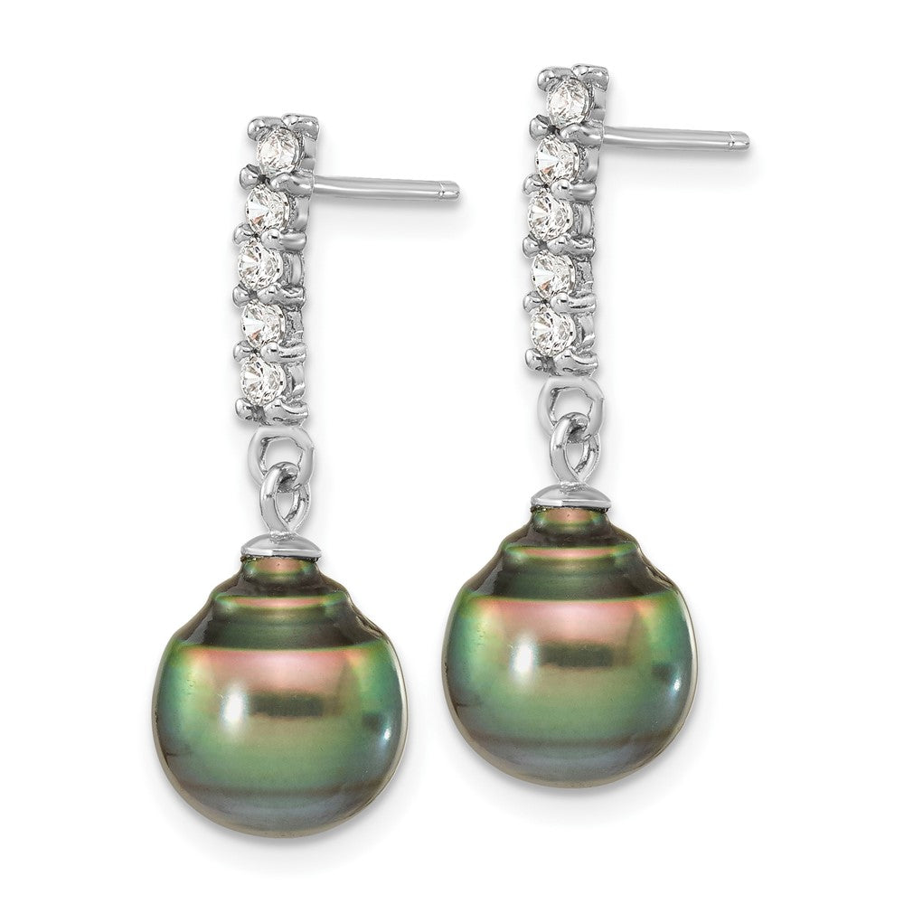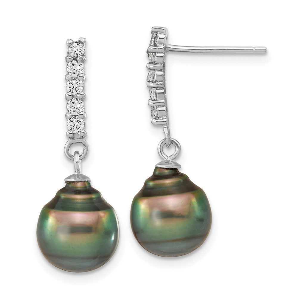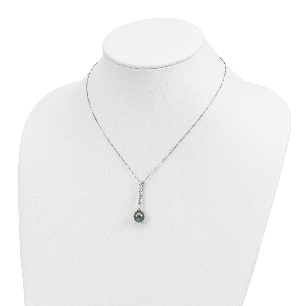 Sterling Silver Rhodium-plated 9-10mm Black Teardrop Tahitian Saltwater Pearl and CZ 17 inch Necklace and Post Dangle Earrings Set