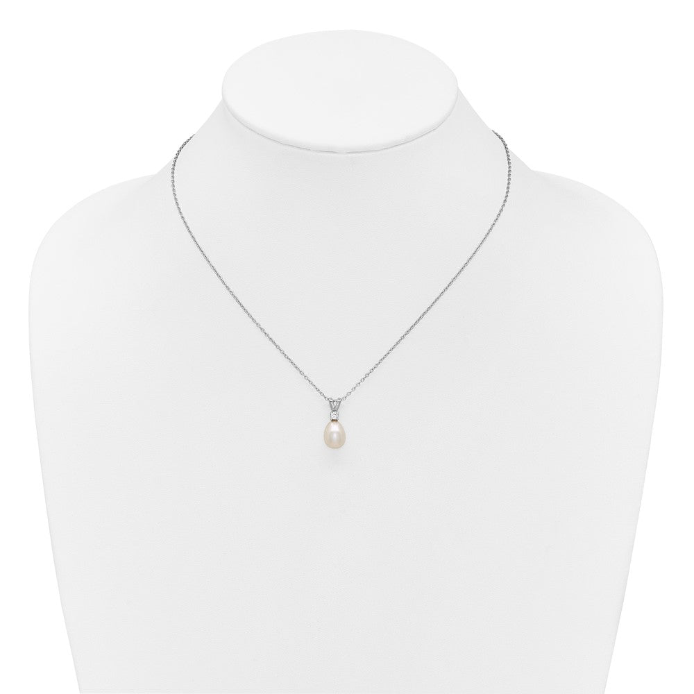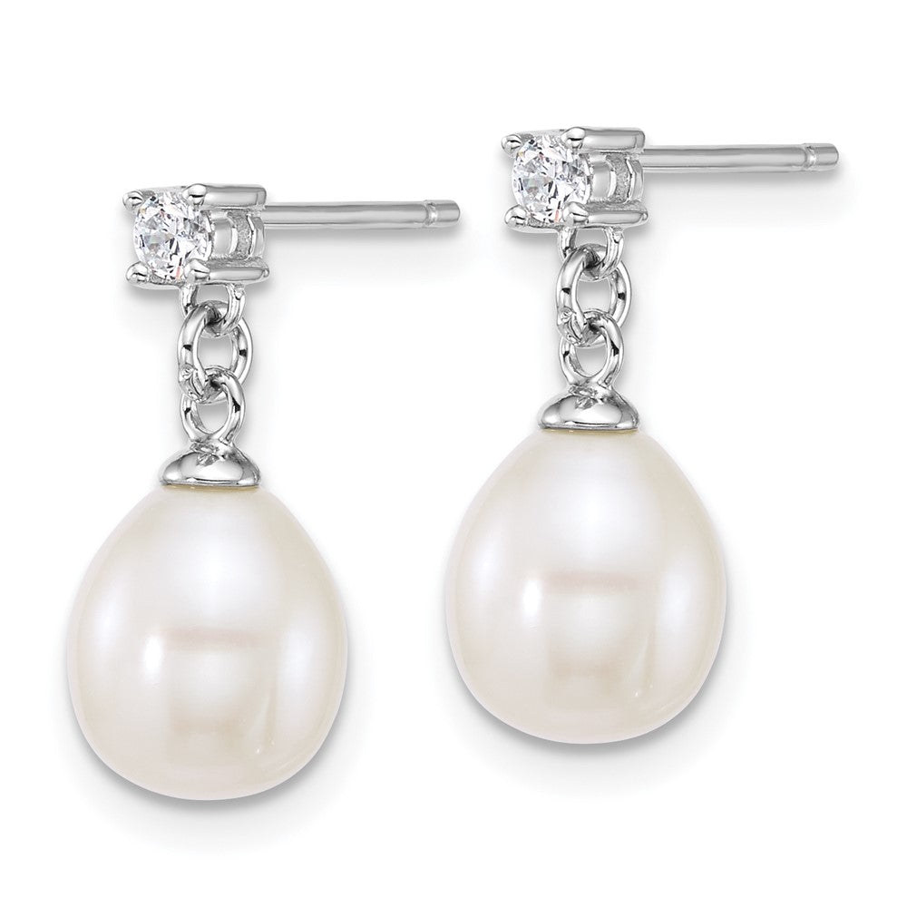 Sterling Silver Rhodium-plated 7-9mm Teardrop White Freshwater Cultured Pearl and CZ 17 inch Necklace and Dangle Post Earring Set
