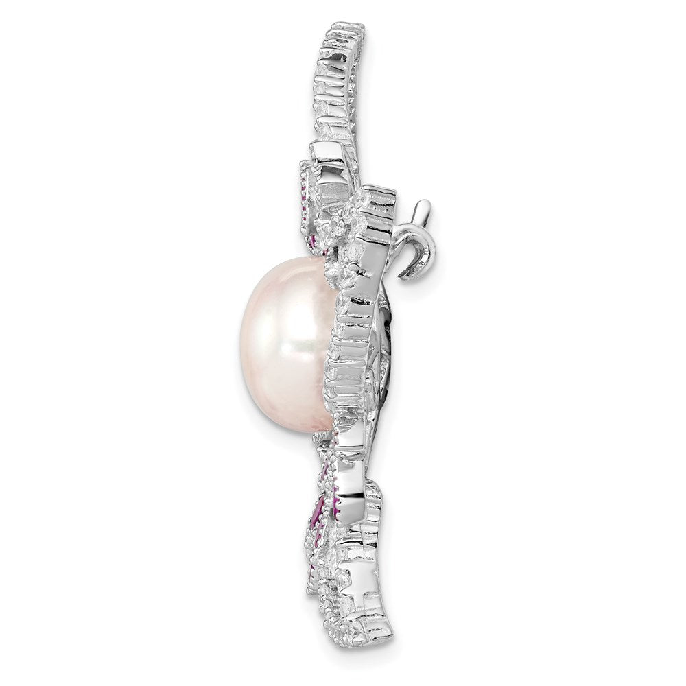 Sterling Silver Rhodium-plated 10-11mm White Button Freshwater Cultured Pearl, CZ and 2.50 Carat Pink Corundum Flower Pin