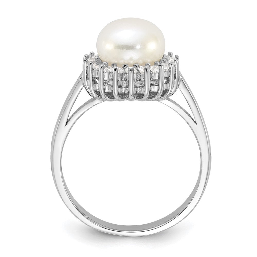 Sterling Silver Rhodium-plated 8-9mm White Freshwater Cultured Pearl and CZ Ring