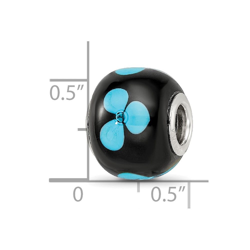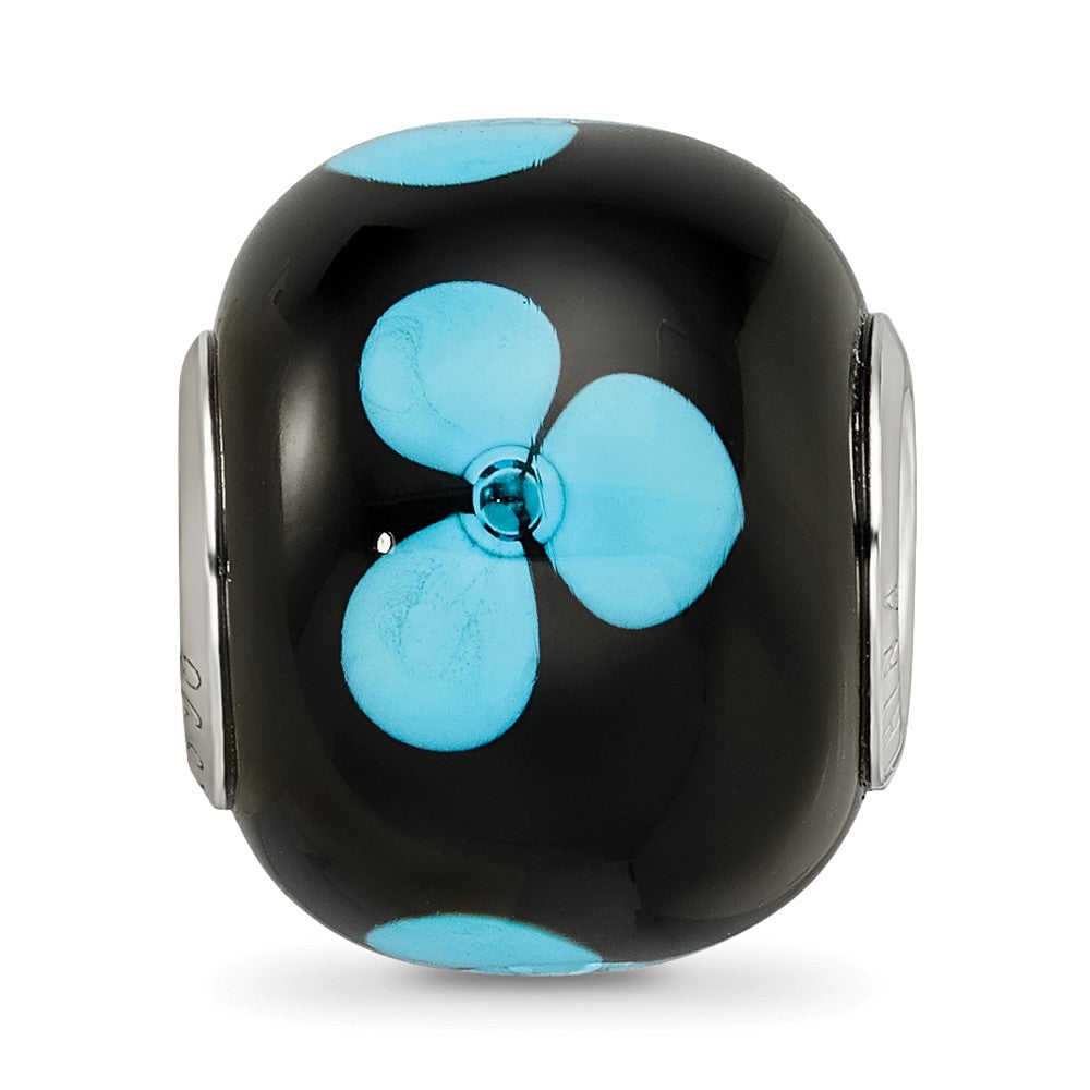 Sterling Silver Reflections Rhodium-plated Blue Floral Black Glass Bead