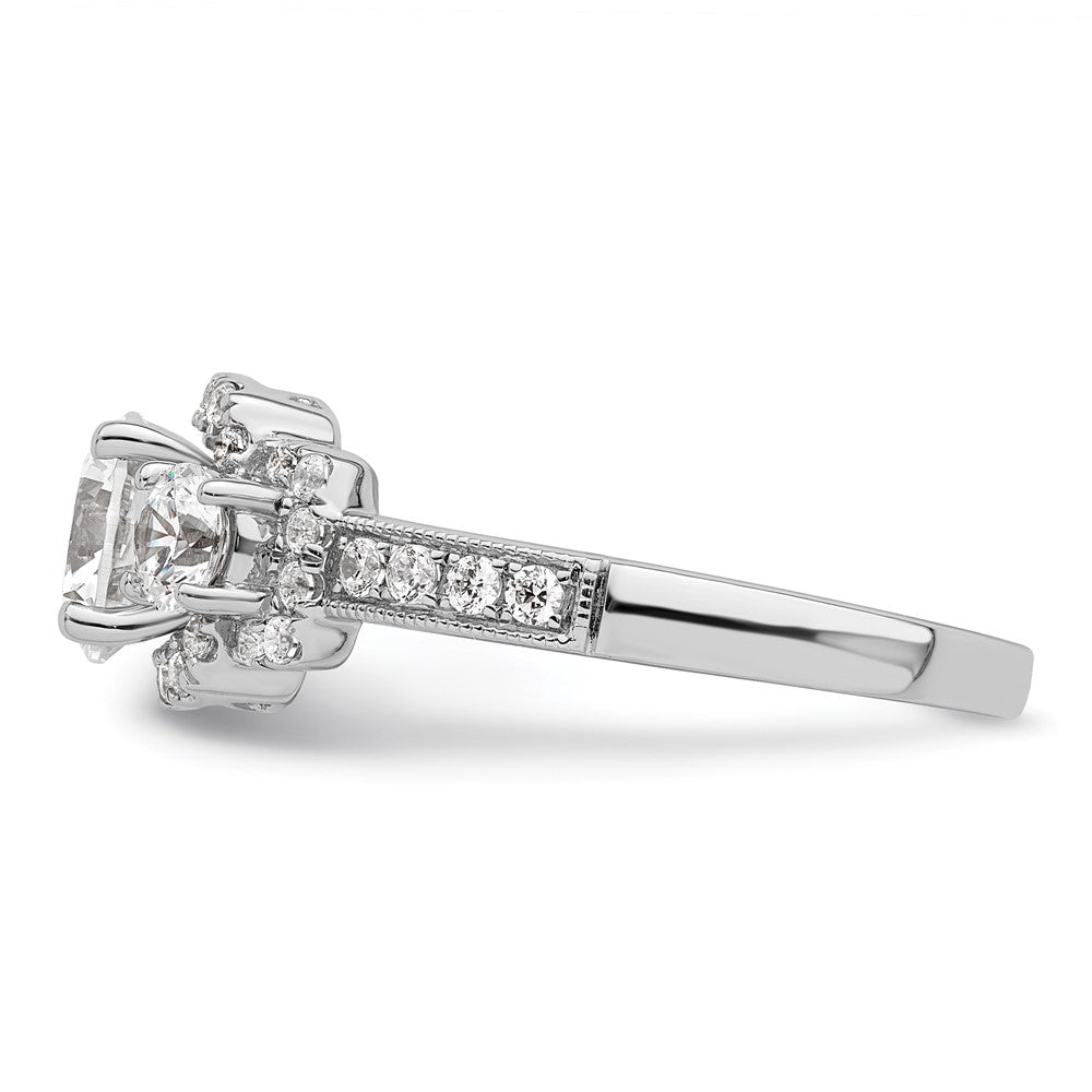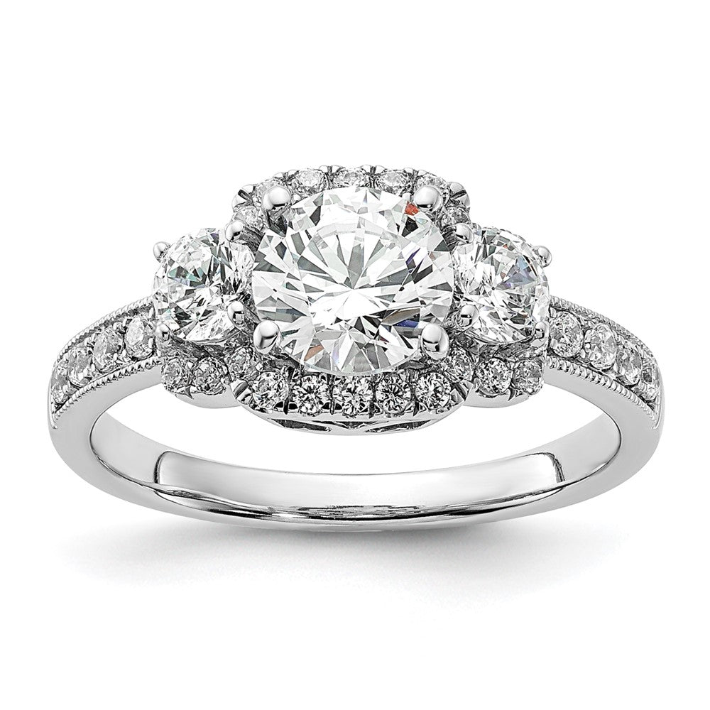 14K White 3-Stone Plus (Holds 1 carat (6.5mm) Round Center) Halo Semi-Mount Diamond Engagement Ring