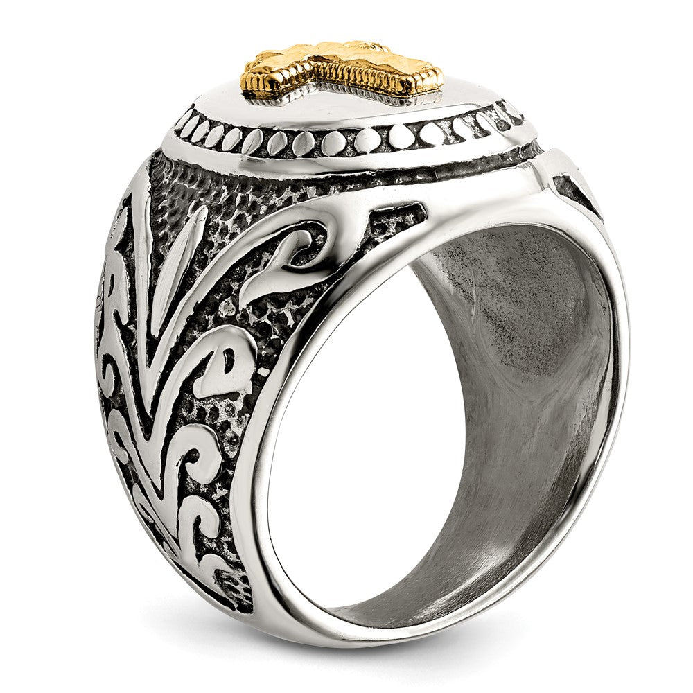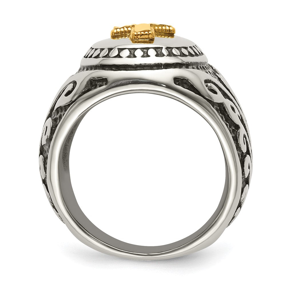 Chisel Stainless Steel with 14k Gold Accent Antiqued and Polished Cross Ring