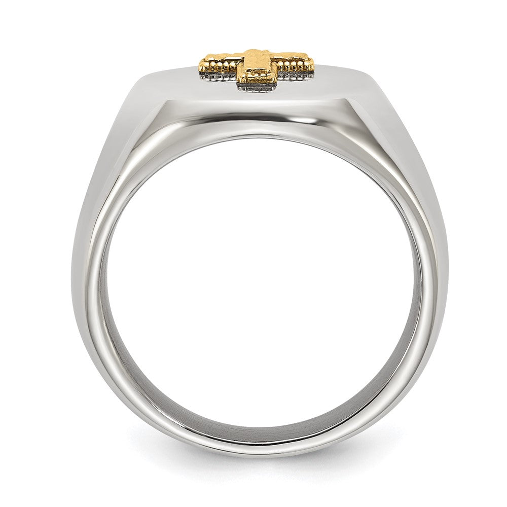 Chisel Stainless Steel Polished with Diamond-cut 14K Gold Accent Cross Oval Signet Ring