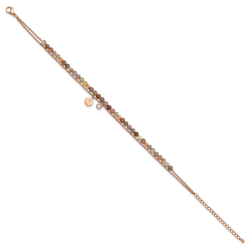 Chisel Stainless Steel Polished Rose IP-plated with Crystal and Imitation Sardonyx Cross 9 inch Anklet Plus 2 inch Extension