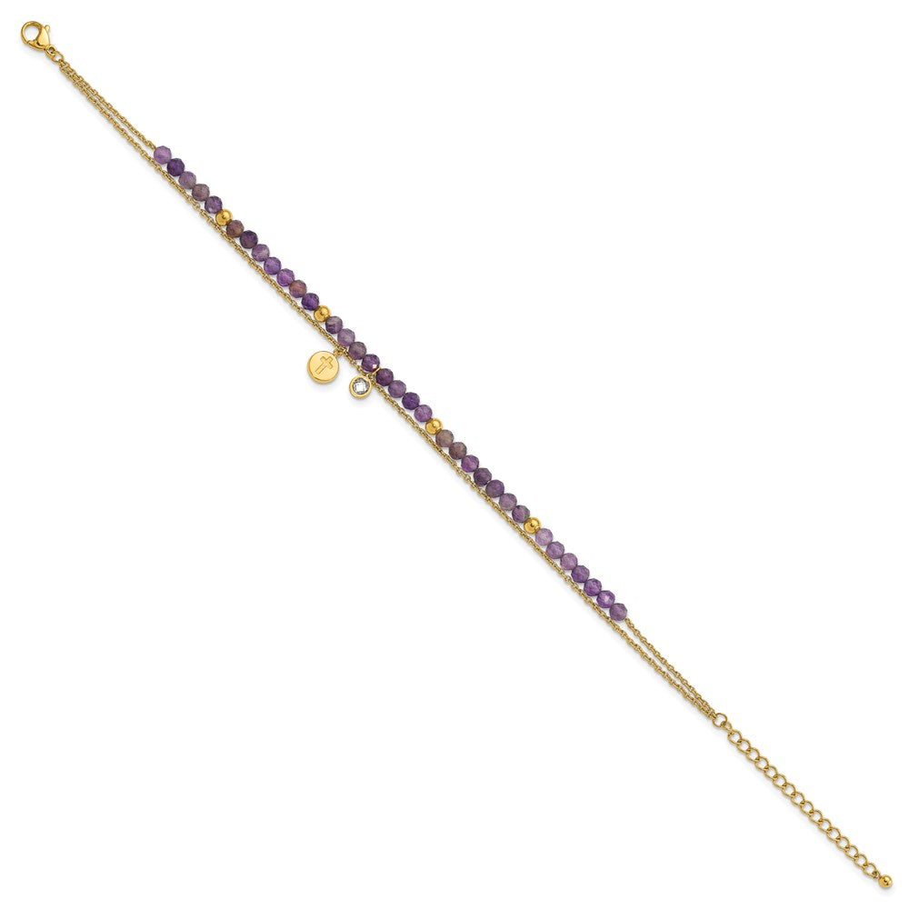 Chisel Stainless Steel Polished Yellow IP-plated Amethyst and Crystal Cross 9 inch Anklet Plus 2 inch Extension