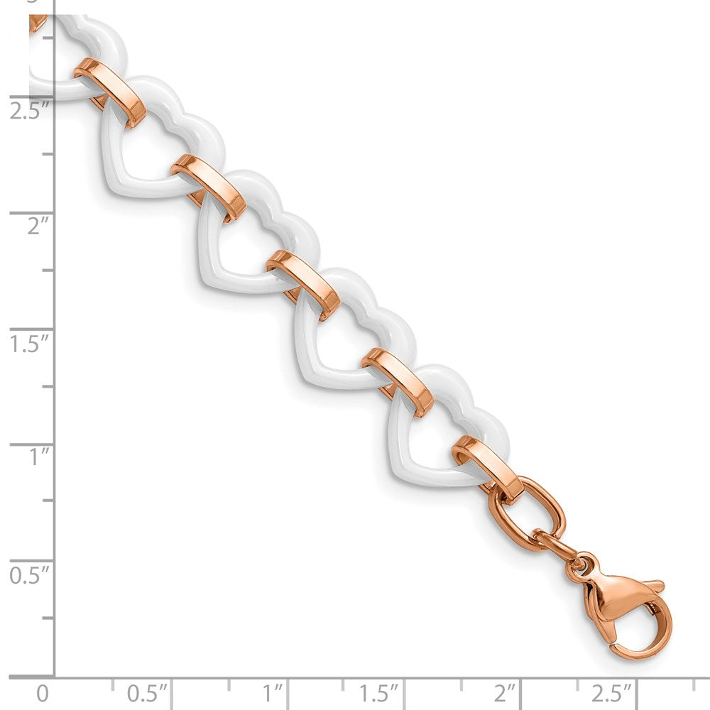 Chisel Stainless Steel Polished Rose IP-plated with White Ceramic Heart Links 7.25 inch Bracelet with .75 inch Extension