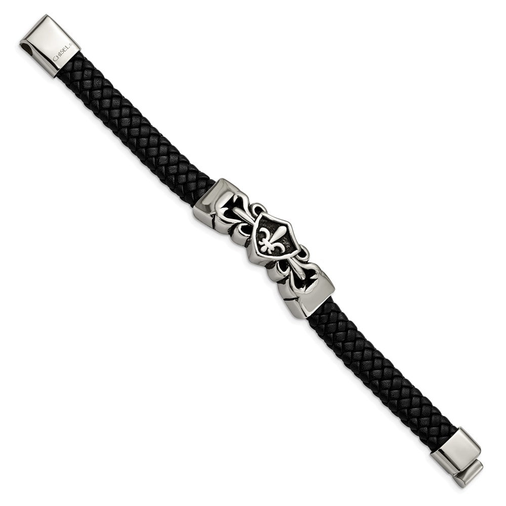 Chisel Stainless Steel Antiqued and Polished Fleur de Lis Black Braided Leather 8.25 inch Bracelet