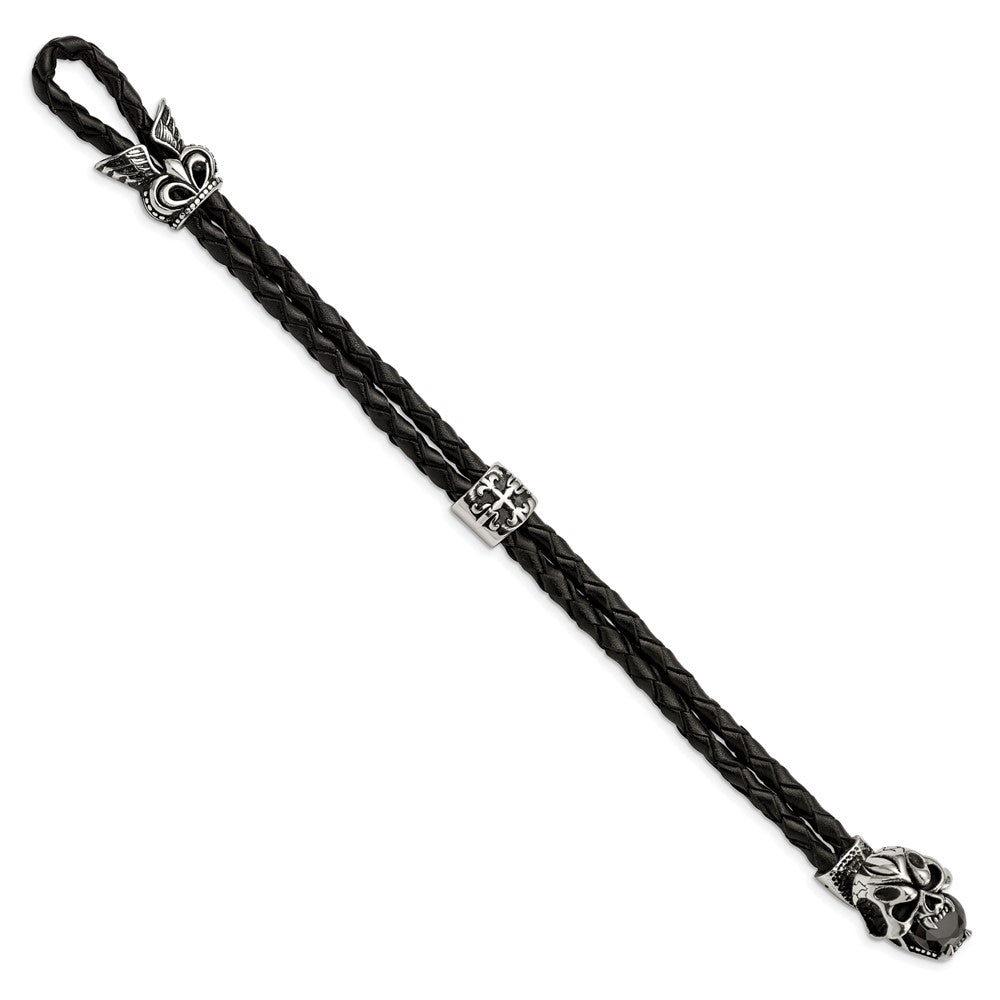 Chisel Stainless Steel Polished and Enameled Skull with Black Glass 2 Strand Braided Black Leather 8.5 inch Bracelet