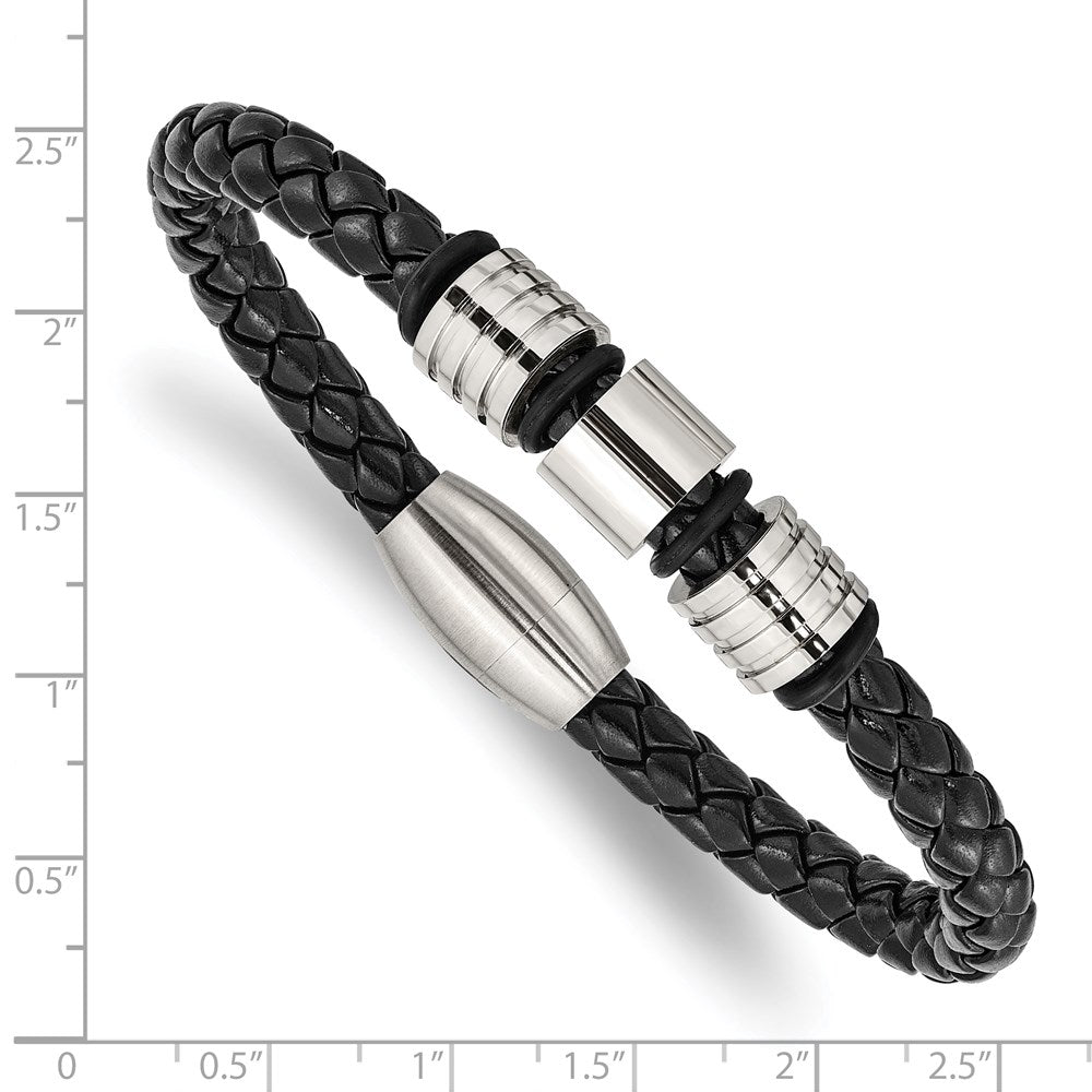 Chisel Stainless Steel Brushed and Polished Braided Black Leather 8.5 inch Bracelet