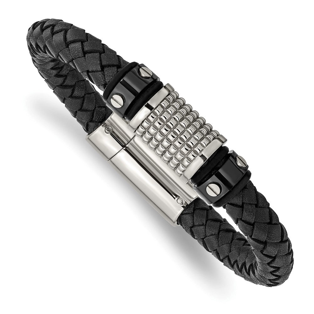 Chisel Stainless Steel Polished and Textured Black IP-plated Black Braided Leather and Rubber 8.5 inch Bracelet