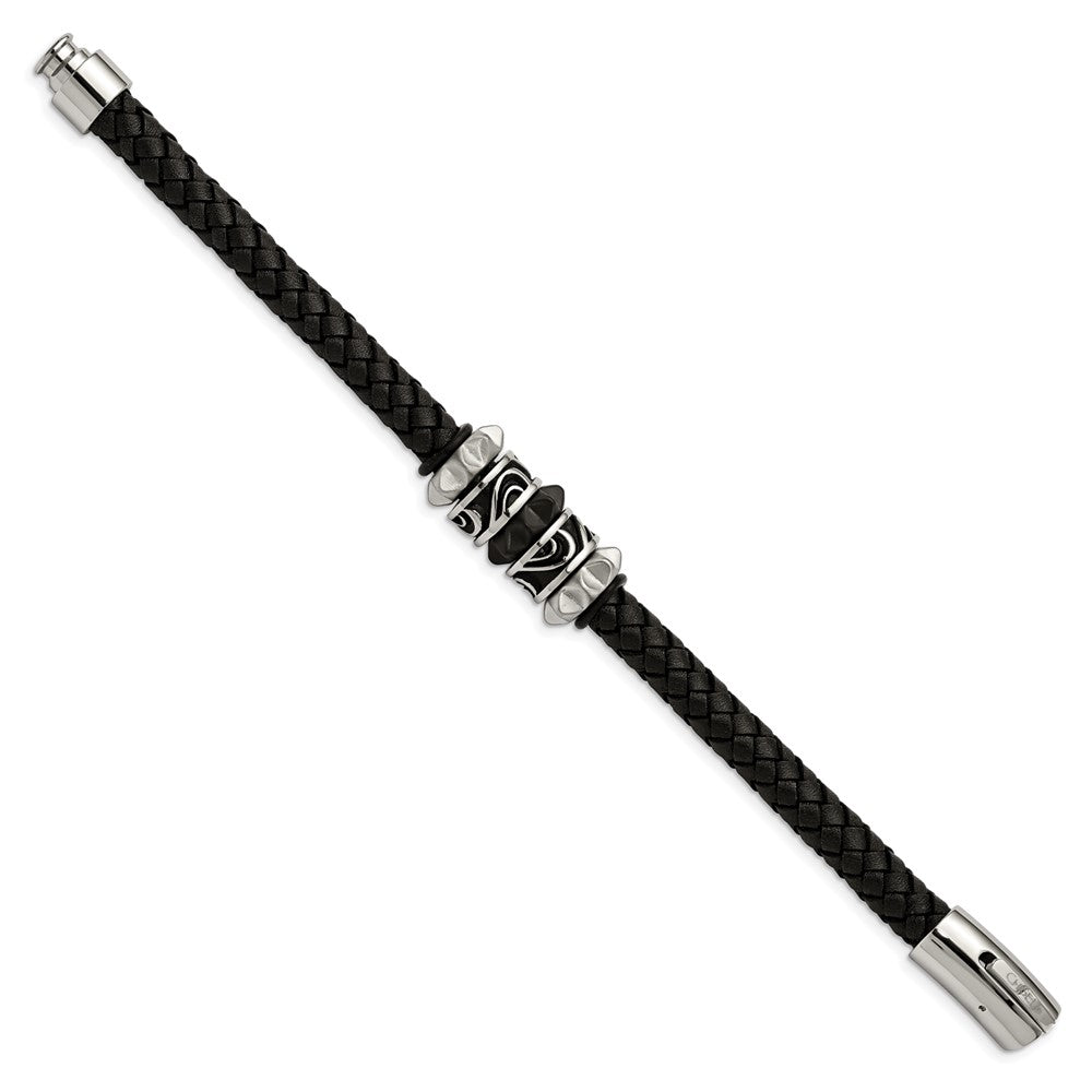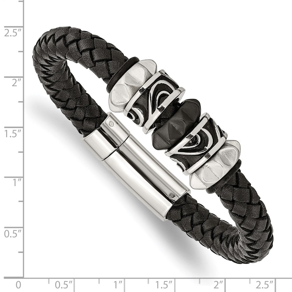 Chisel Stainless Steel Antiqued Brushed and Polished Black IP-plated Black Braided Leather 8.5 inch Bracelet