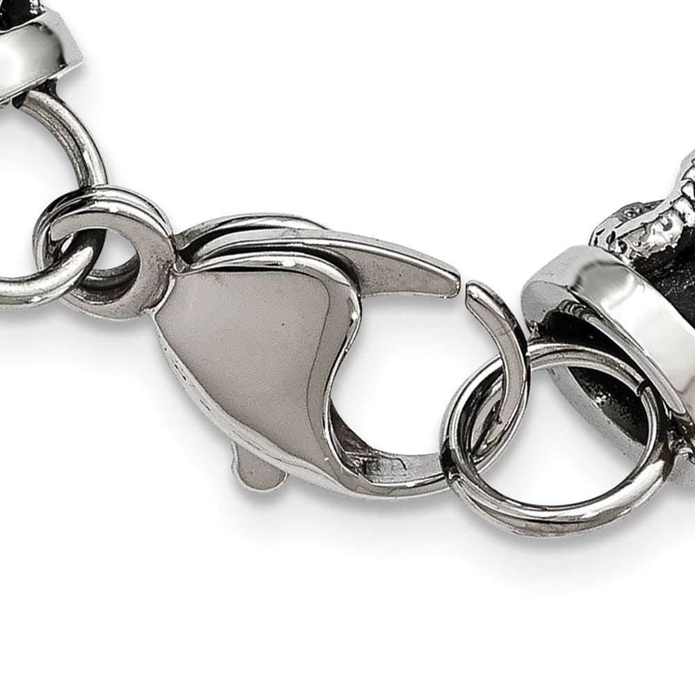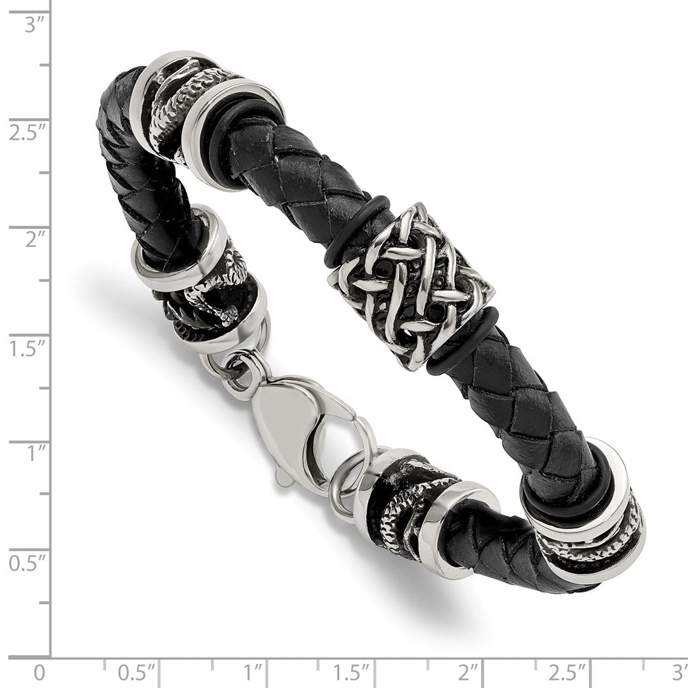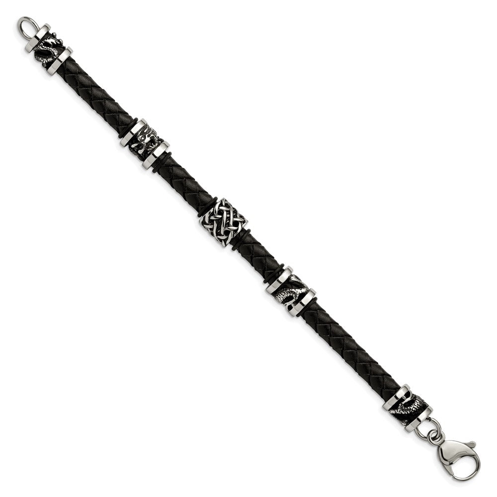 Chisel Stainless Steel Antiqued and Polished Dragon Black Braided Leather 8.5 inch Bracelet