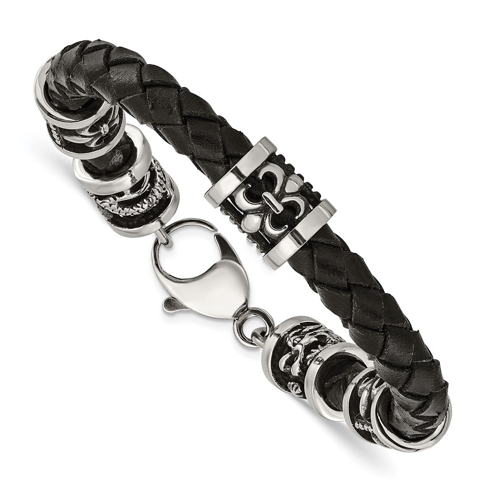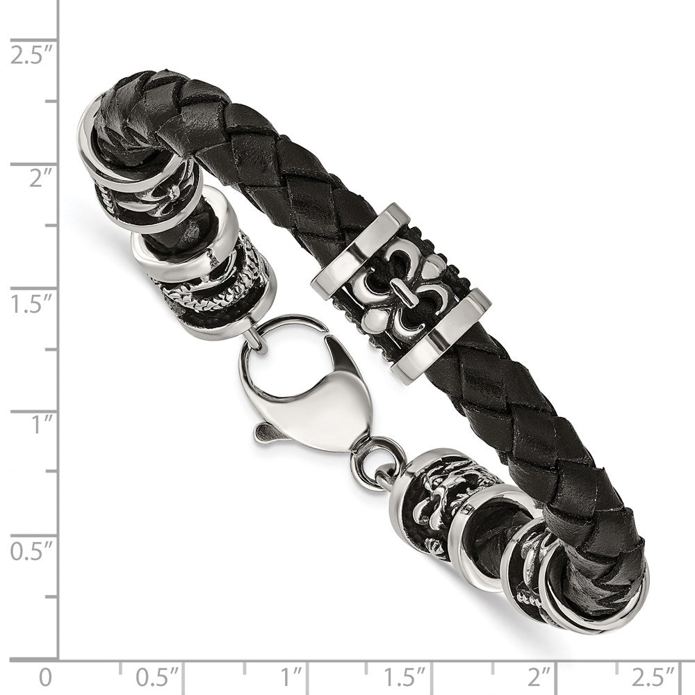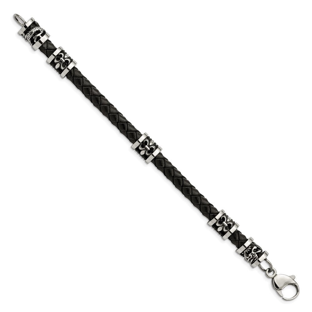 Chisel Stainless Steel Antiqued and Polished Fleur de Lis and Dragon Black Braided Leather 8.5 inch Bracelet