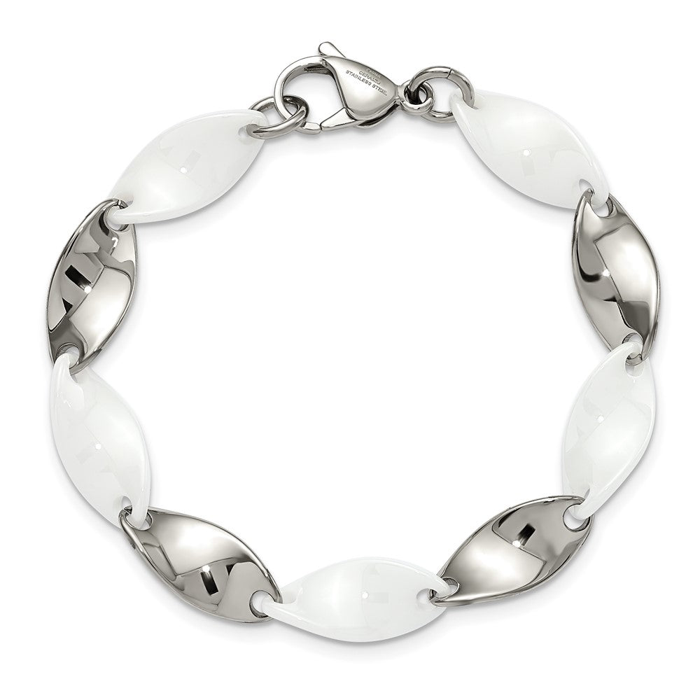 Chisel Stainless Steel Polished with White Ceramic 7.75 inch Twisted Link Bracelet