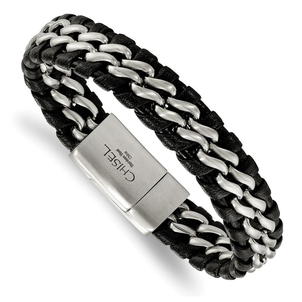 Chisel Stainless Steel Brushed Black Leather 8.5 inch Bracelet