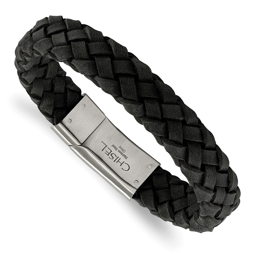 Chisel Stainless Steel Brushed Black Braided Leather 8.25 inch Bracelet