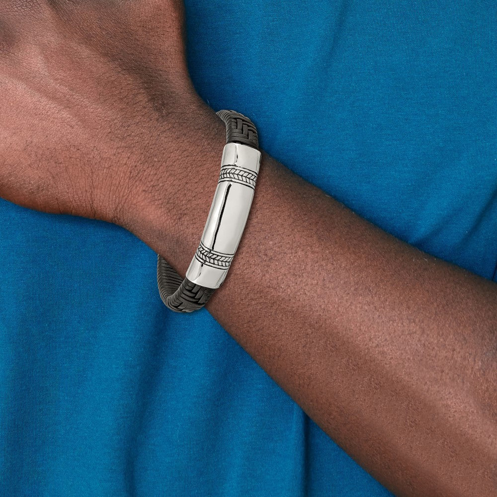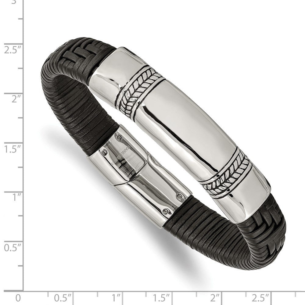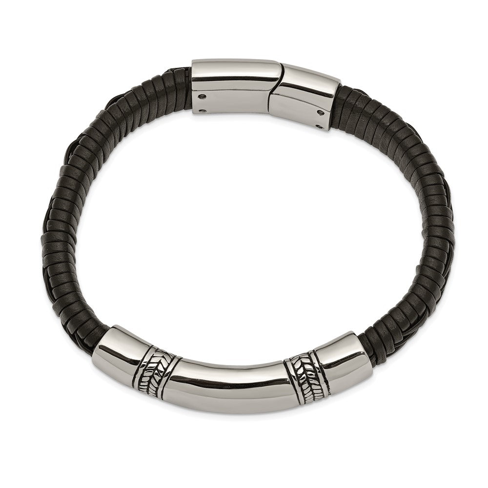 Chisel Stainless Steel Antiqued and Polished Black Woven Leather 8.25 inch ID Bracelet