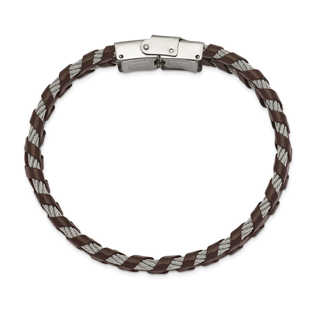 Chisel Stainless Steel Polished Cable and Brown Leather 8.25 inch Bracelet