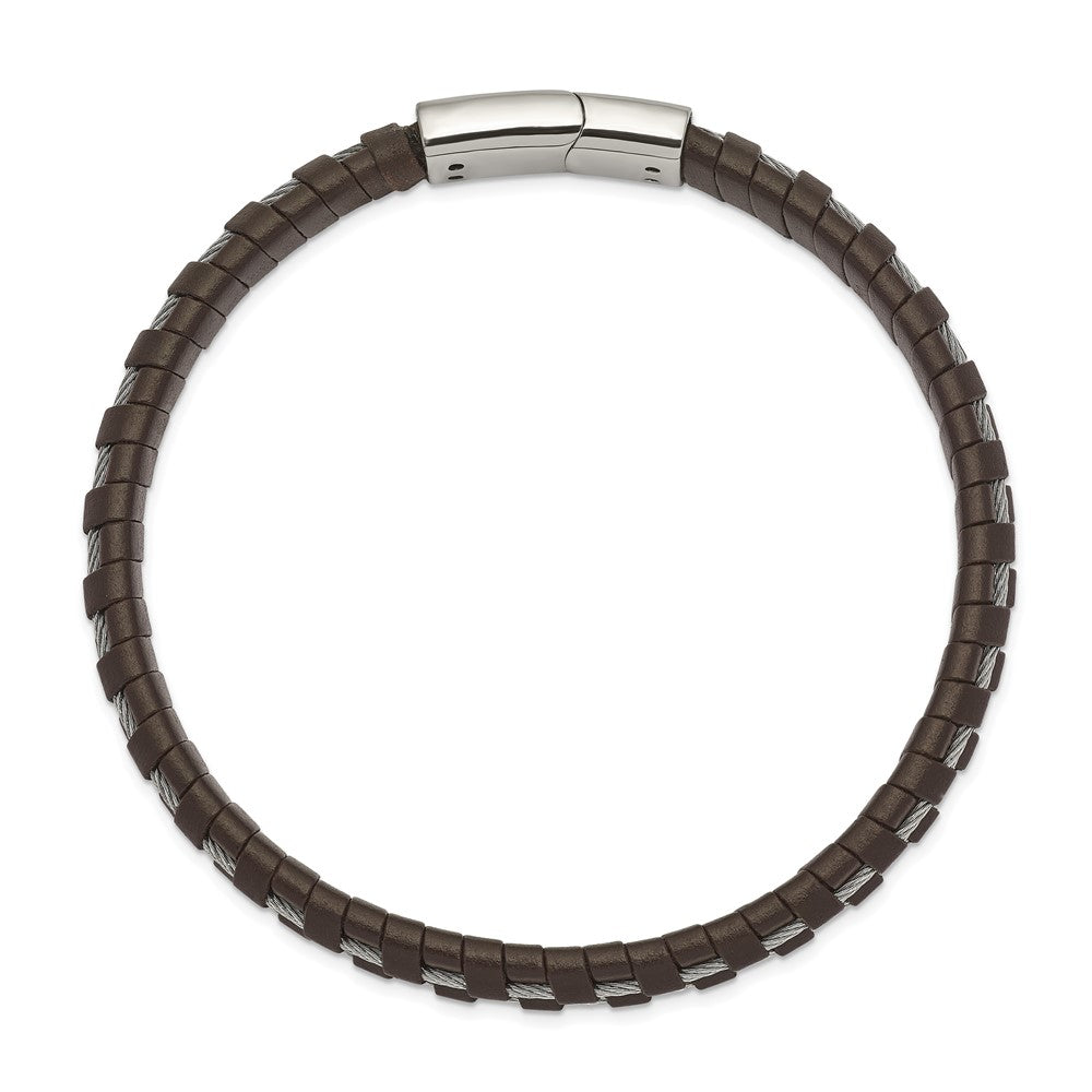 Chisel Stainless Steel Polished Cable and Brown Leather 8.75 inch Bracelet