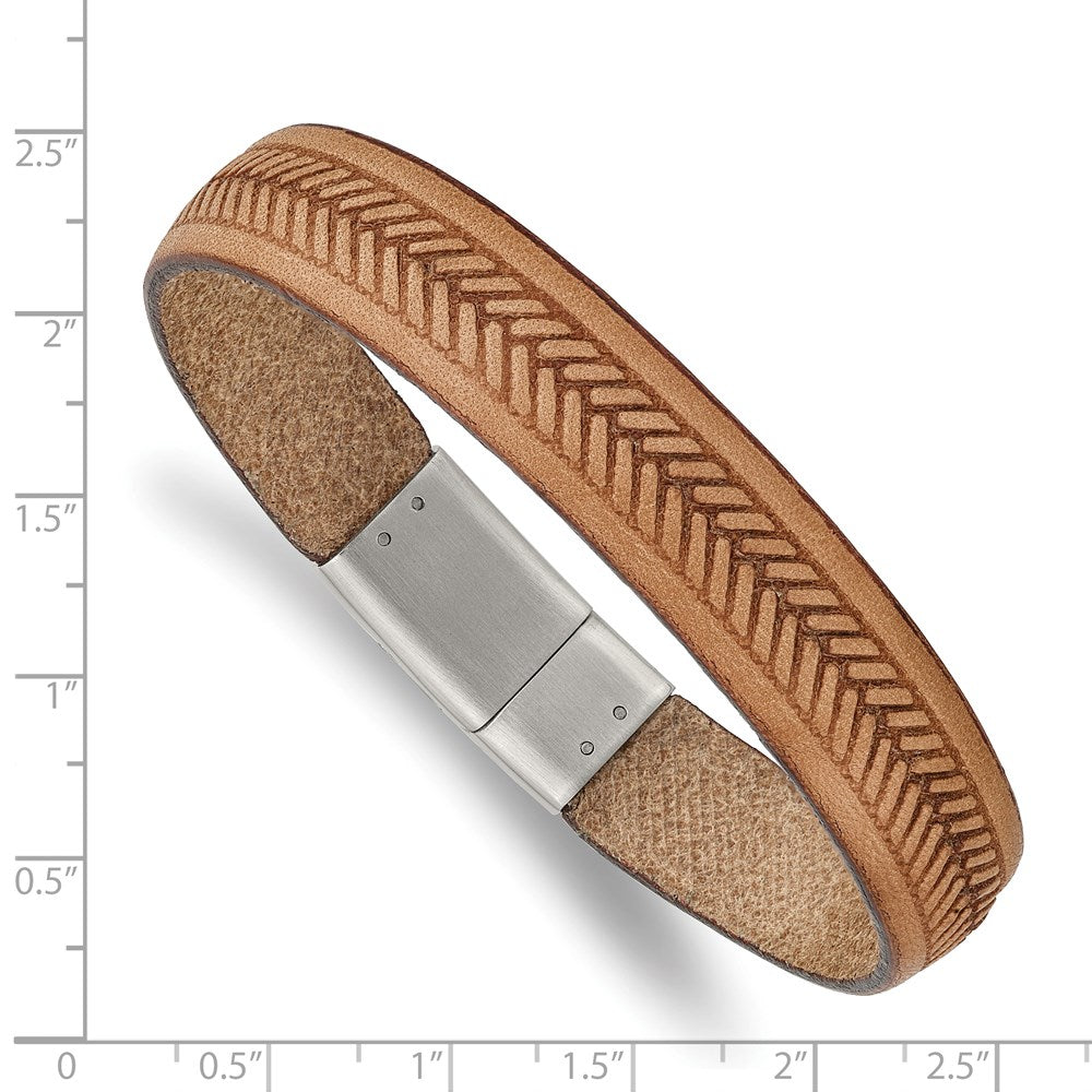 Chisel Stainless Steel Polished Textured Tan Italian Leather 8.75 inch Bracelet