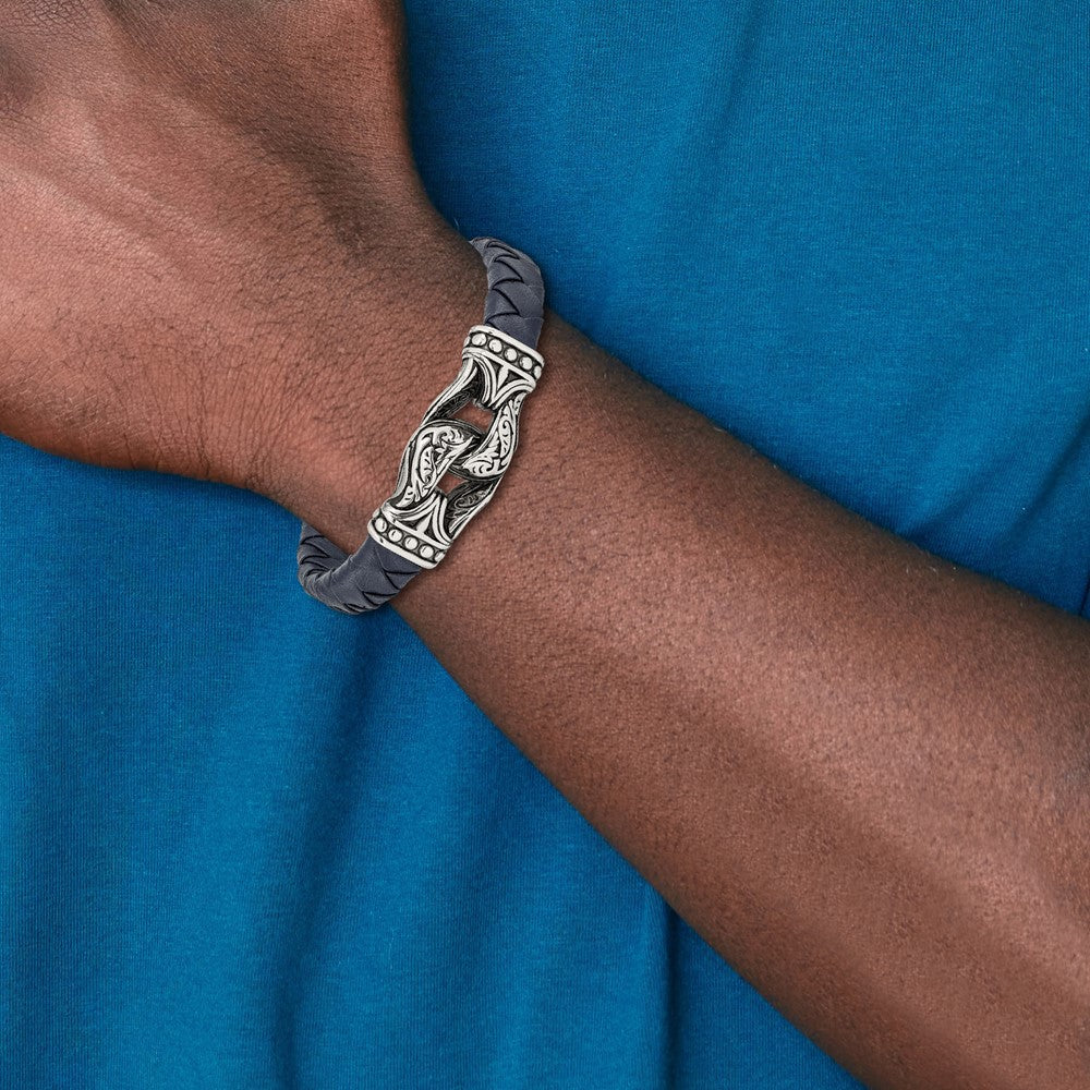 Chisel Stainless Steel Antiqued and Polished Blue Woven Leather 8.75 inch Bracelet