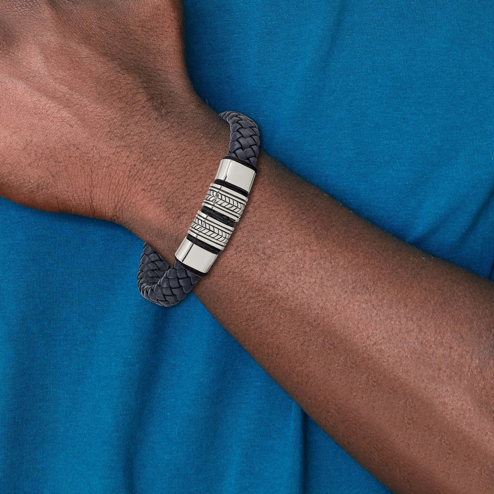 Chisel Stainless Steel Antiqued and Polished Braided Blue Leather with Black Silicone 8.25 inch Bracelet