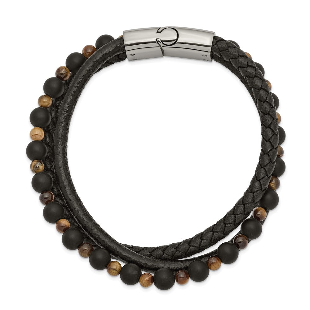 Chisel Stainless Steel Polished Multi Strand Tiger's Eye and Black Agate Beaded Black Leather 8.25 inch Bracelet