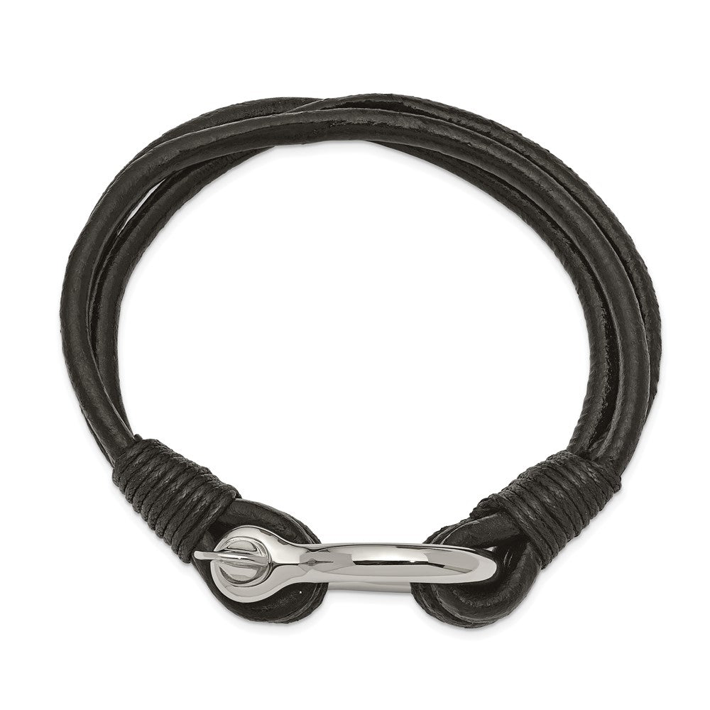 Chisel Stainless Steel Polished Shackle Multi Strand Black Leather 8.5 inch Bracelet