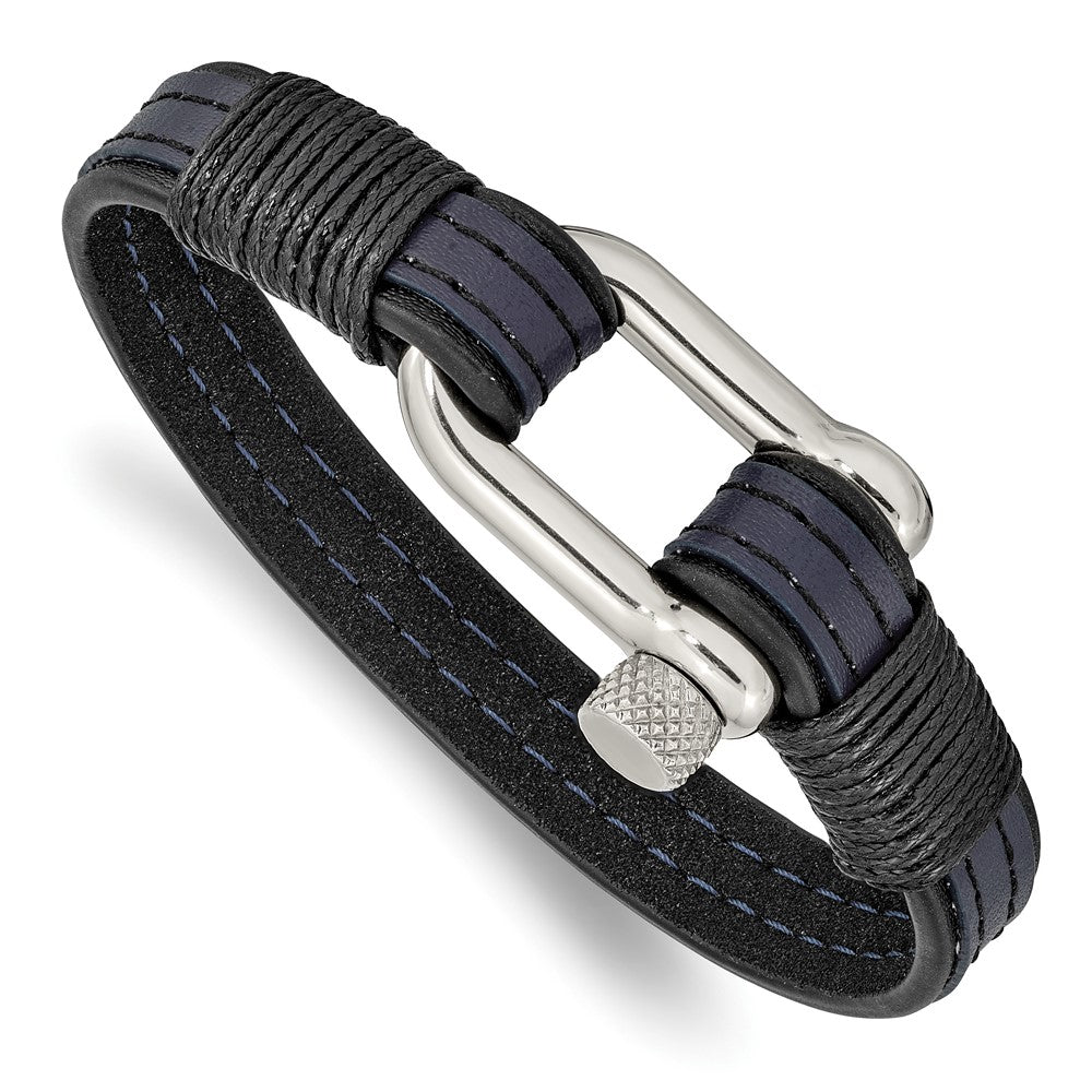 Chisel Stainless Steel Polished Shackle Black and Blue Leather 8.25 inch Bracelet
