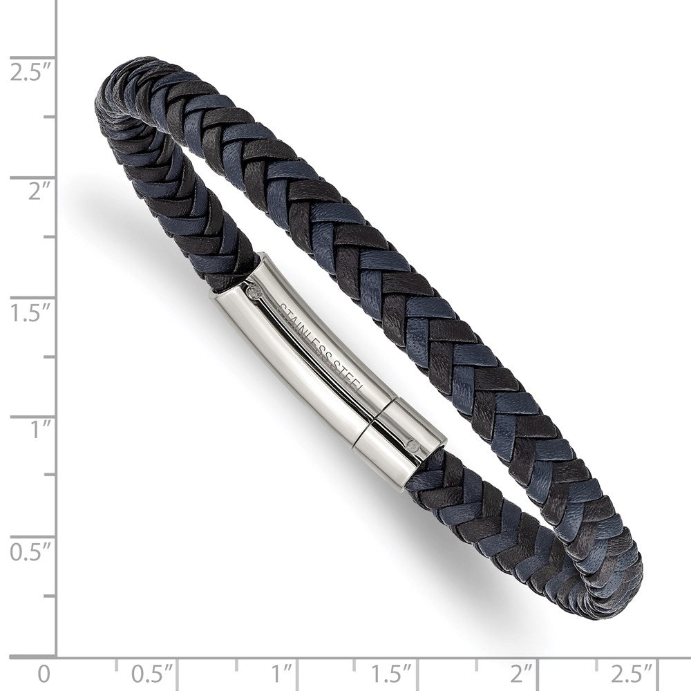 Chisel Stainless Steel Polished Black and Blue Braided Leather 8.25 inch Bracelet