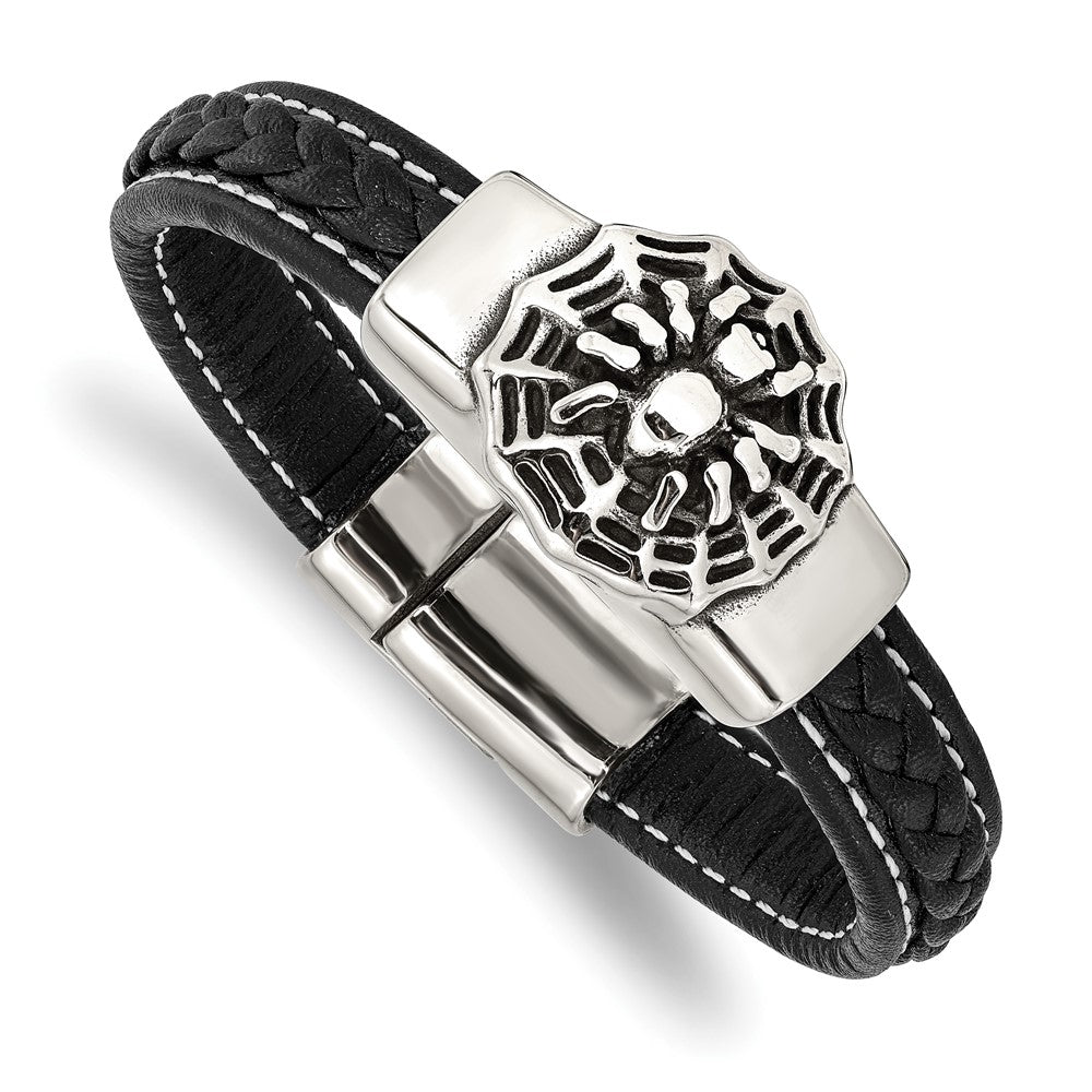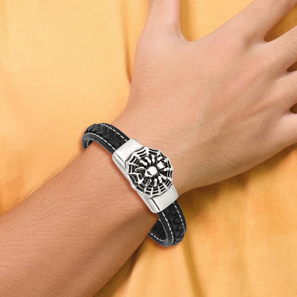 Chisel Stainless Steel Antiqued and Polished Spider Black Braided Faux Leather 8.5 inch Bracelet