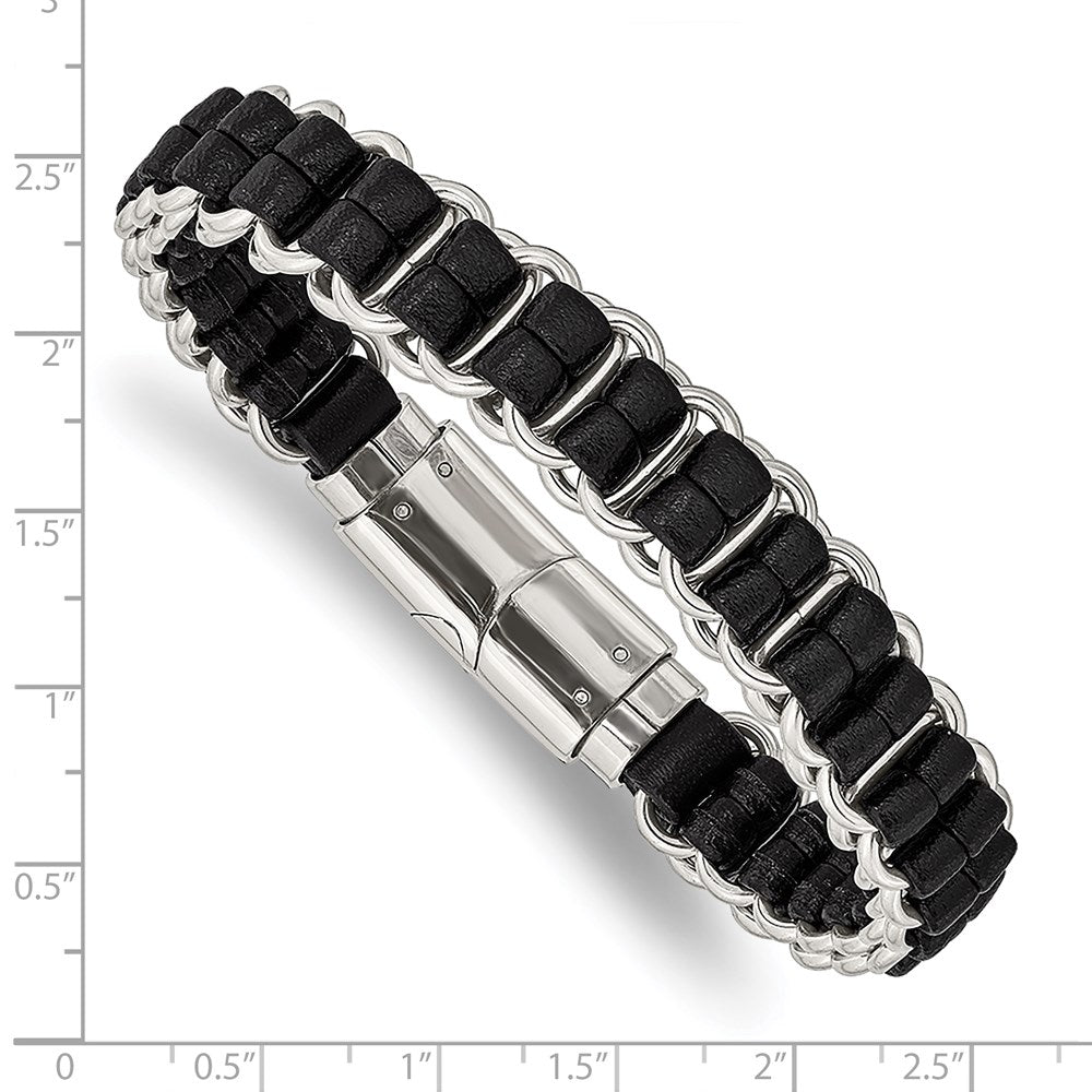 Chisel Stainless Steel Polished Black Leather 8.5 inch Bracelet