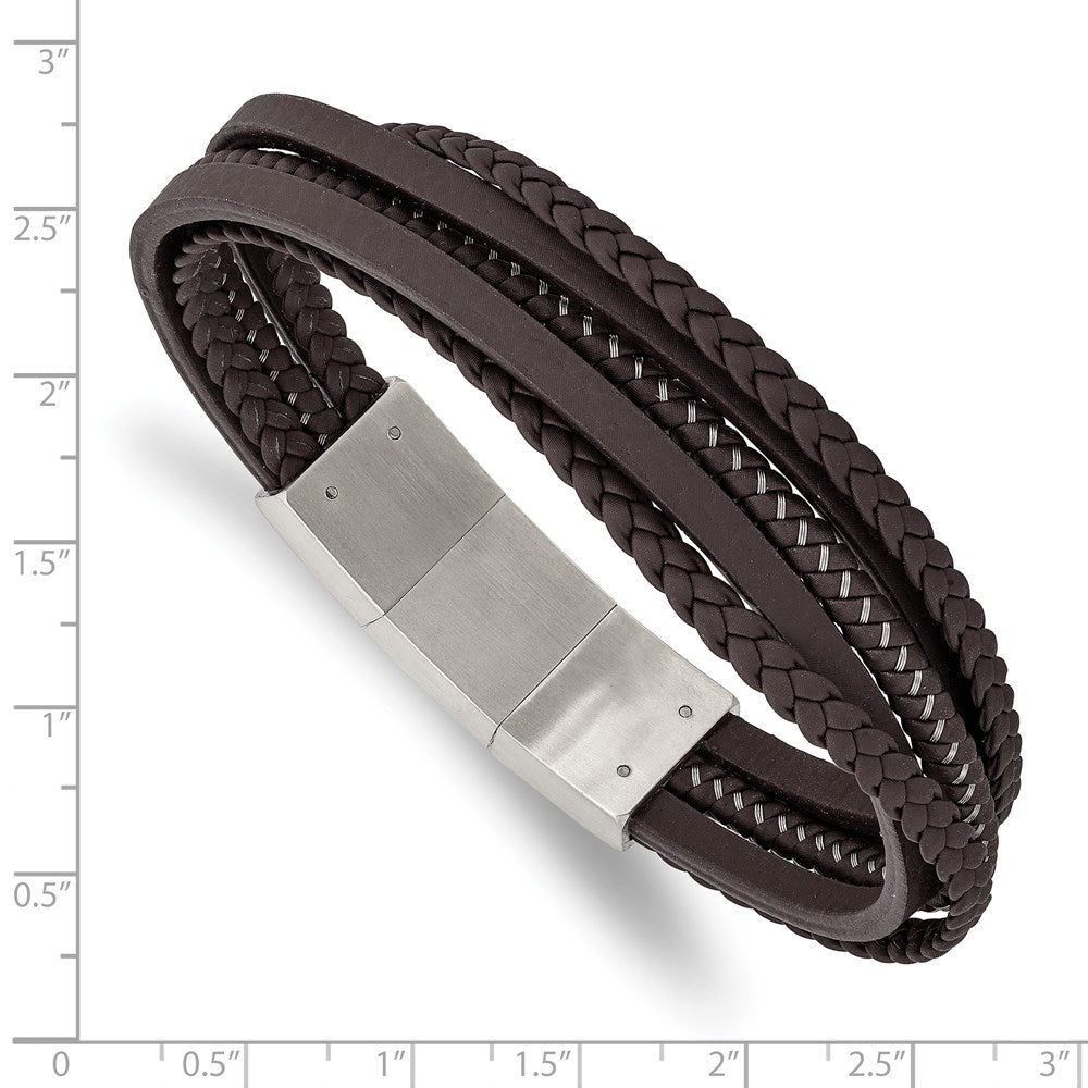 Chisel Stainless Steel Brushed Multi Strand Brown Braided Leather and Wire 8.25 inch Bracelet with .5 inch Extension