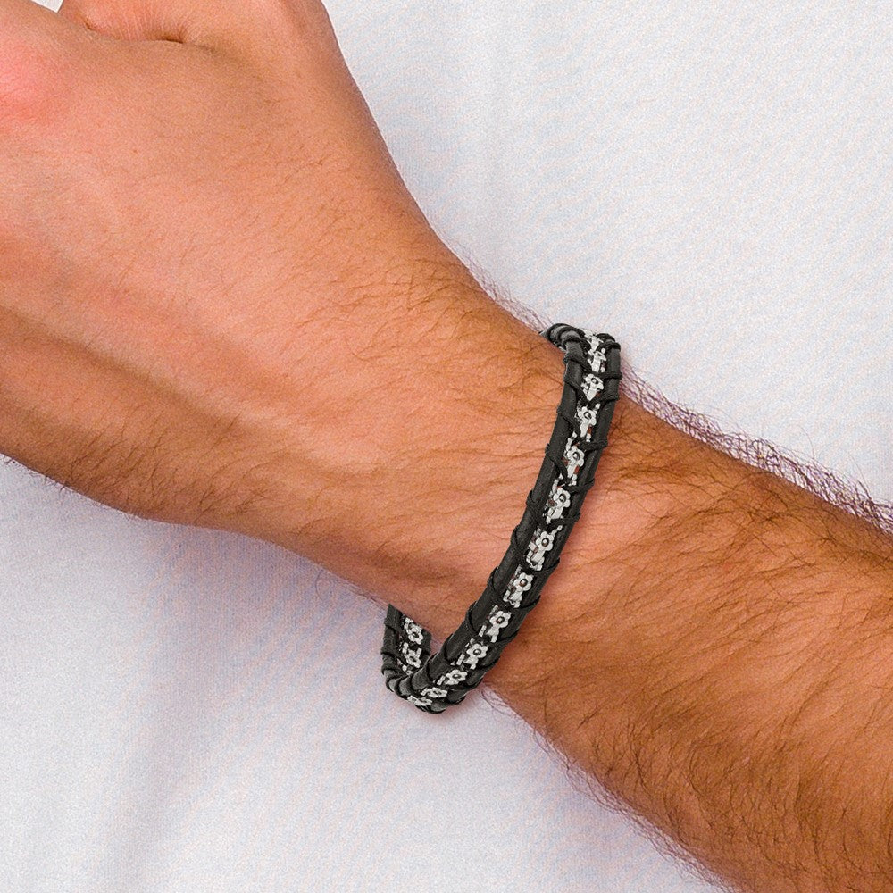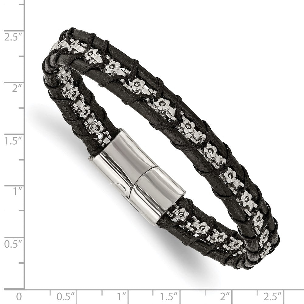 Chisel Stainless Steel Polished Flower Link Black Leather 8.25 inch Bracelet