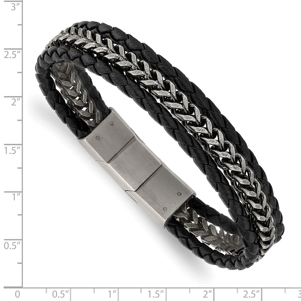 Chisel Stainless Steel Antiqued and Brushed Multi Strand Chain and Black Leather 8.25 inch Bracelet with .5 inch Extension