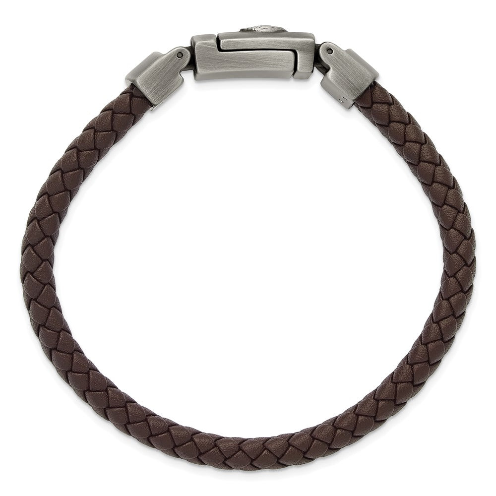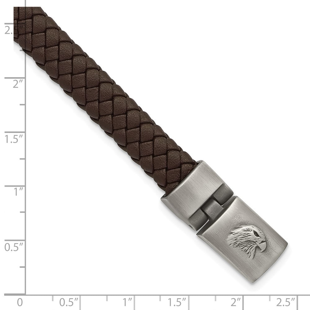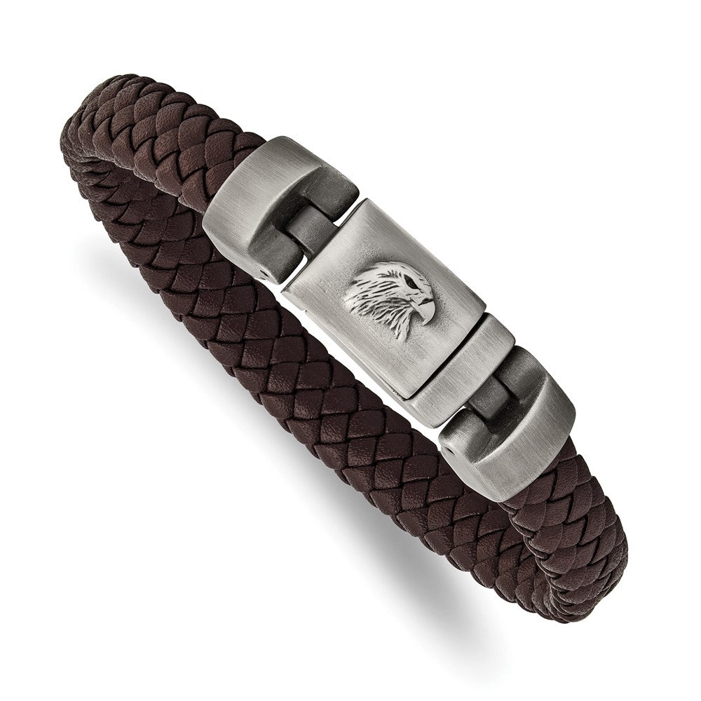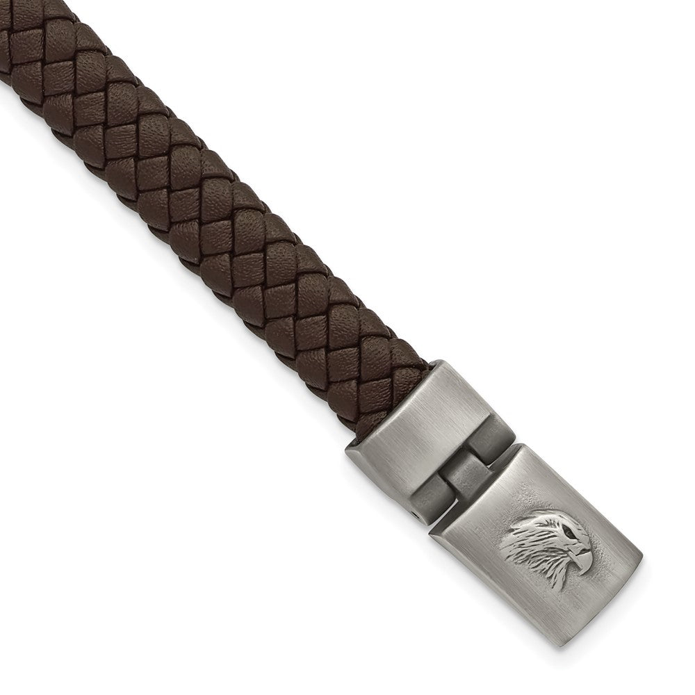 Chisel Stainless Steel Antiqued and Brushed Eagle Head Brown Braided Leather 8.75 inch Bracelet
