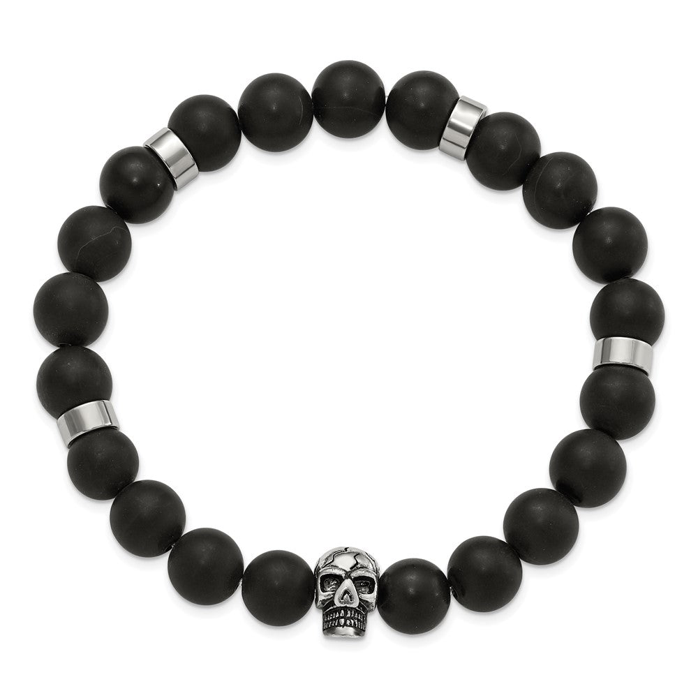 Chisel Stainless Steel Antiqued and Polished Black Agate Beaded with Skulls Stretch Bracelet